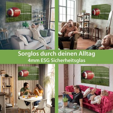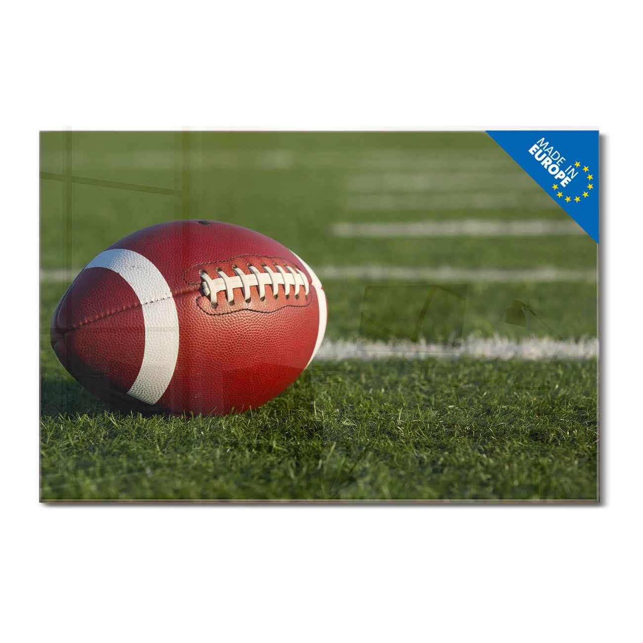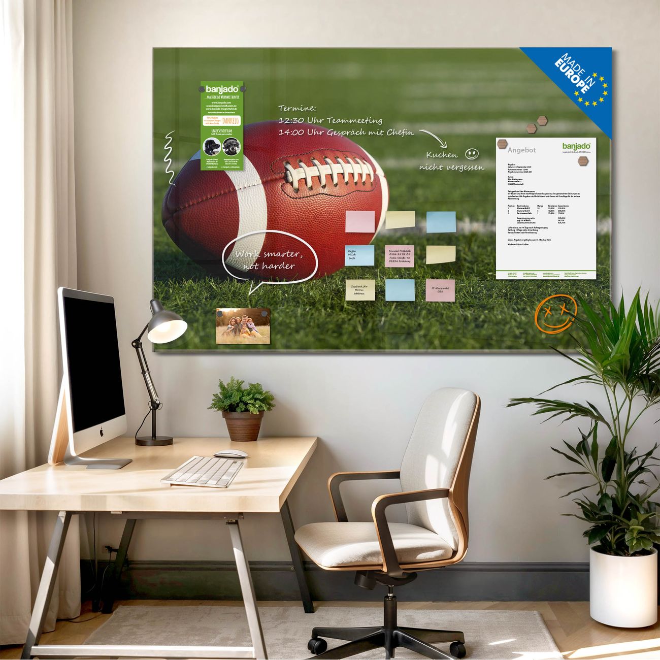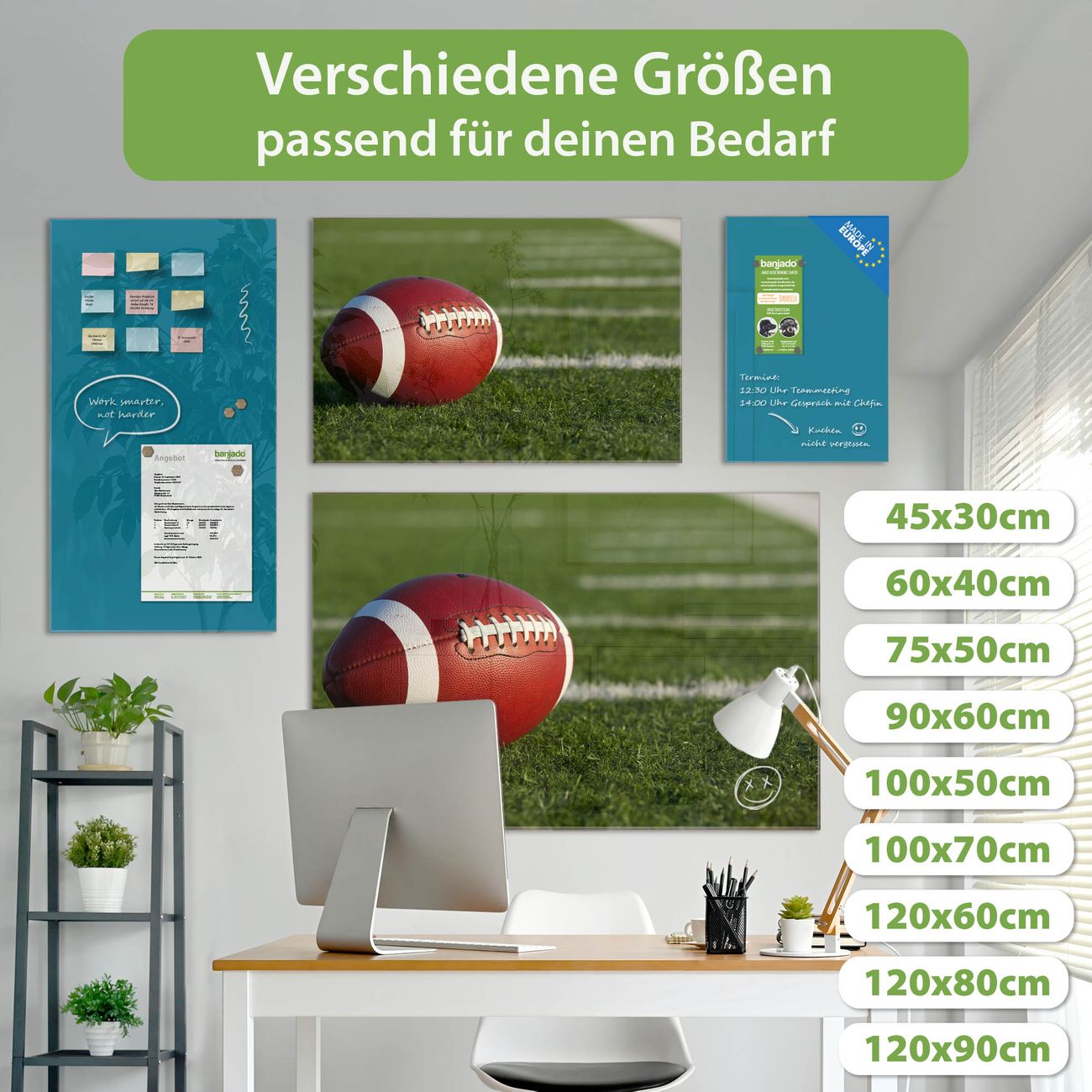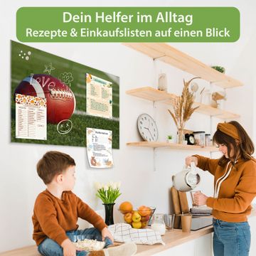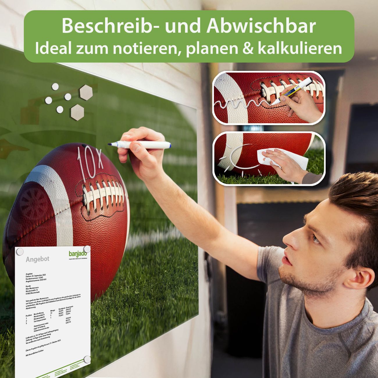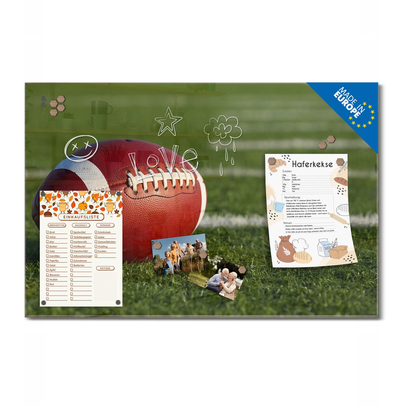 Material: 4mm Sicherheitsglas mit Metallrückwand Eigenschaften: beschreibbar, magnetisch, kratzfest Maße: 45x30x0,6cm, 2,03kg schwer Motiv Nummer 12749 Football Zubehör: inklusive 4 Neodym-Magnete