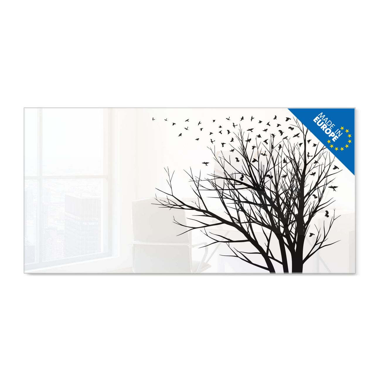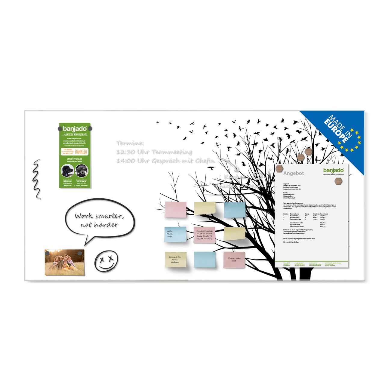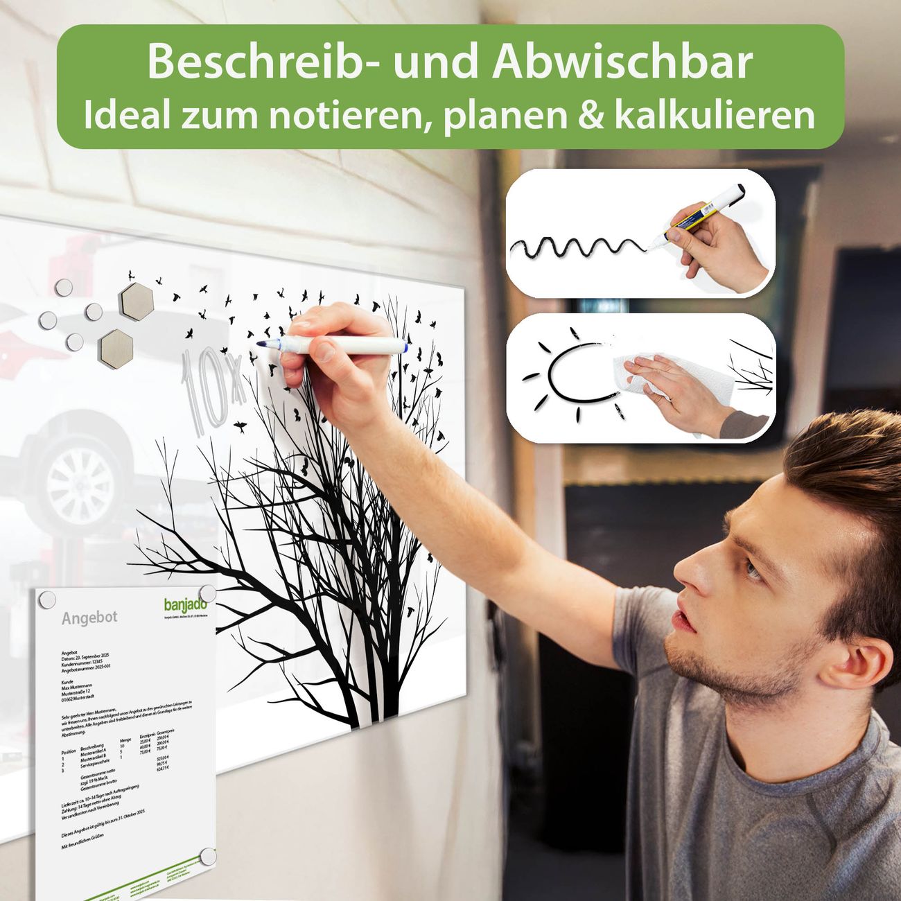 Material: 4mm Sicherheitsglas mit Metallrückwand Eigenschaften: beschreibbar, magnetisch, kratzfest Maße: 100x50x0,6cm, 7,50kg schwer Motiv Nummer 10761 Fortfliegen Zubehör: inklusive 4 Neodym-Magnete
