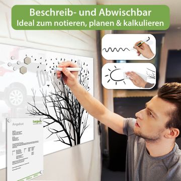 Auf der glatten Glasoberfläche lassen sich Termine, Rezepte oder Notizen ganz einfach mit Kreidestiften festhalten und rückstandslos entfernen. Starke Neodym-Magnete halten Ihre wichtigsten Erinnerungen sicher an Ort und Stelle. So entsteht Ihre ganz persönliche Ideenwand - jeden Tag neu.