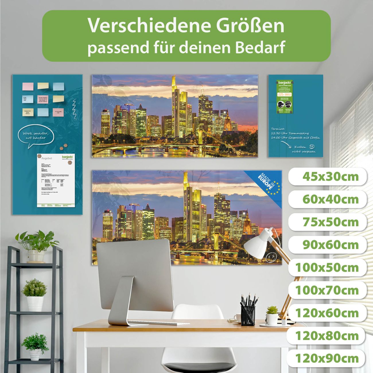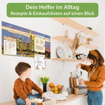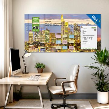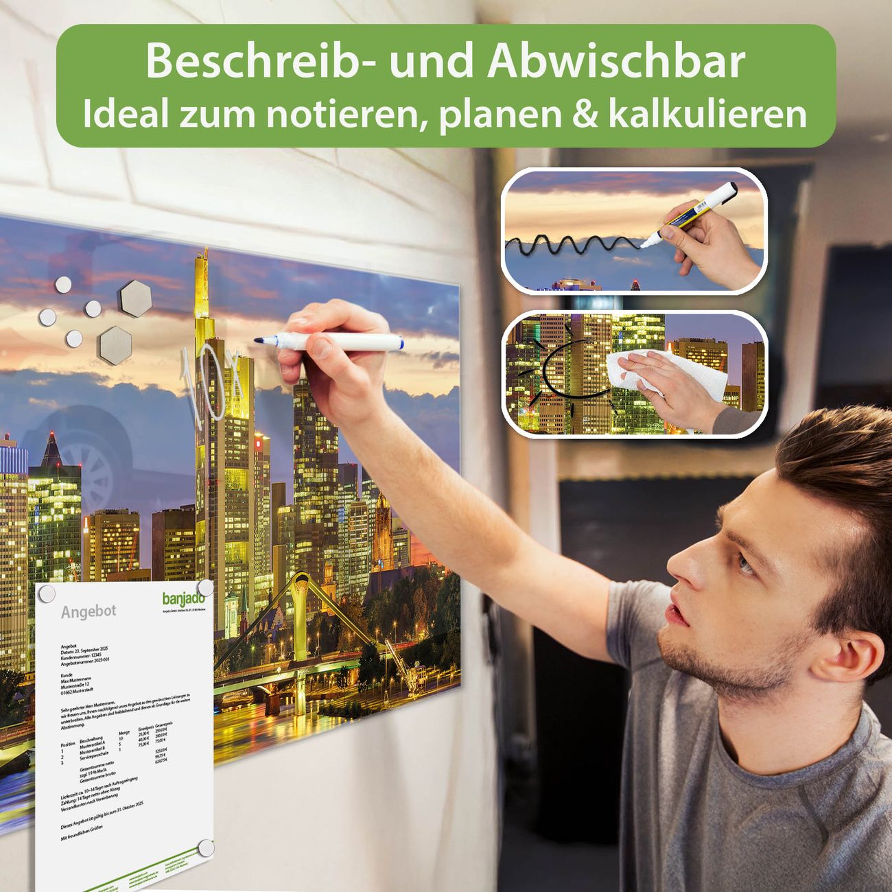 Material: 4mm Sicherheitsglas mit Metallrückwand Eigenschaften: beschreibbar, magnetisch, kratzfest Maße: 100x50x0,6cm, 7,50kg schwer Motiv Nummer 12406 Frankfurt Main Zubehör: inklusive 4 Neodym-Magnete