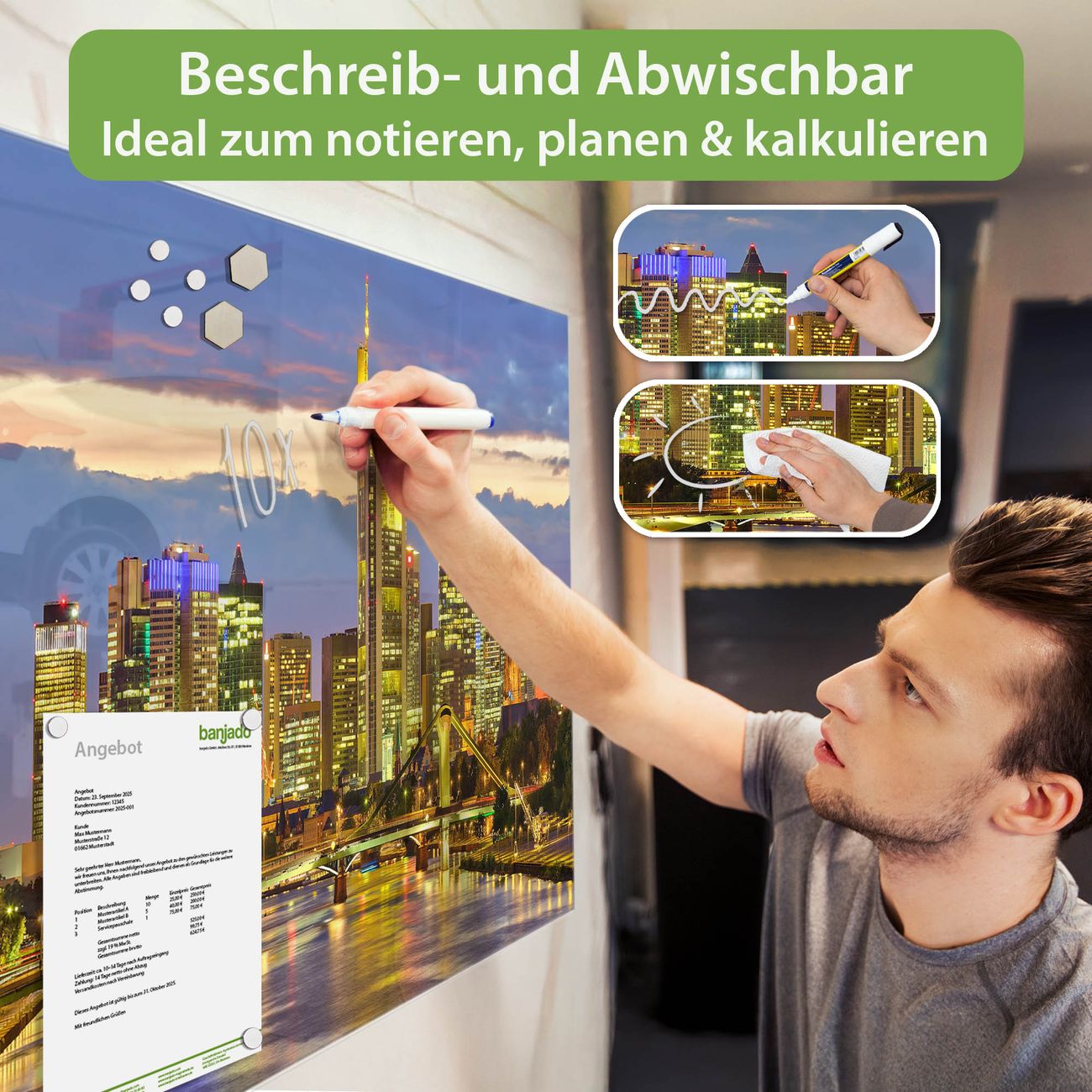 Material: 4mm Sicherheitsglas mit Metallrückwand Eigenschaften: beschreibbar, magnetisch, kratzfest Maße: 45x30x0,6cm, 2,03kg schwer Motiv Nummer 12406 Frankfurt Main Zubehör: inklusive 4 Neodym-Magnete