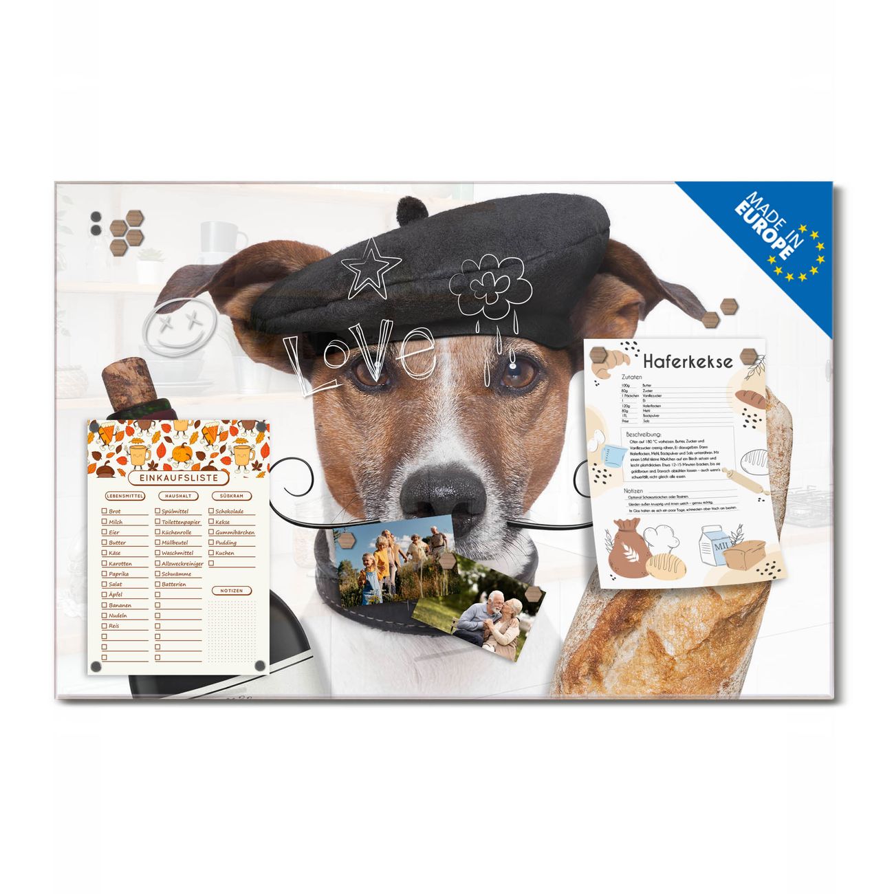Material: 4mm Sicherheitsglas mit Metallrückwand Eigenschaften: beschreibbar, magnetisch, kratzfest Maße: 75x50x0,6cm, 5,63kg schwer Motiv Nummer 10475 Franzose Jack Russel Zubehör: inklusive 4 Neodym-Magnete