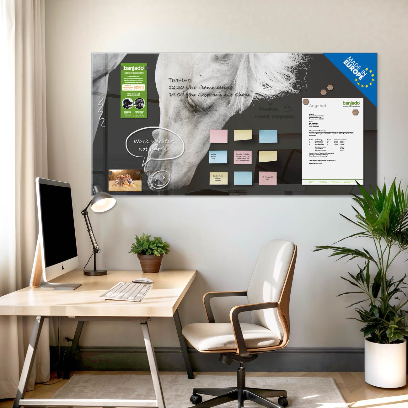 Jede Glas Magnettafel wird in unserer Werkstatt von Hand gefertigt und sorgfältig geprüft. So erhalten Sie ein echtes Qualitätsprodukt, das Funktion und Ästhetik perfekt vereint.?? Warum banjado?