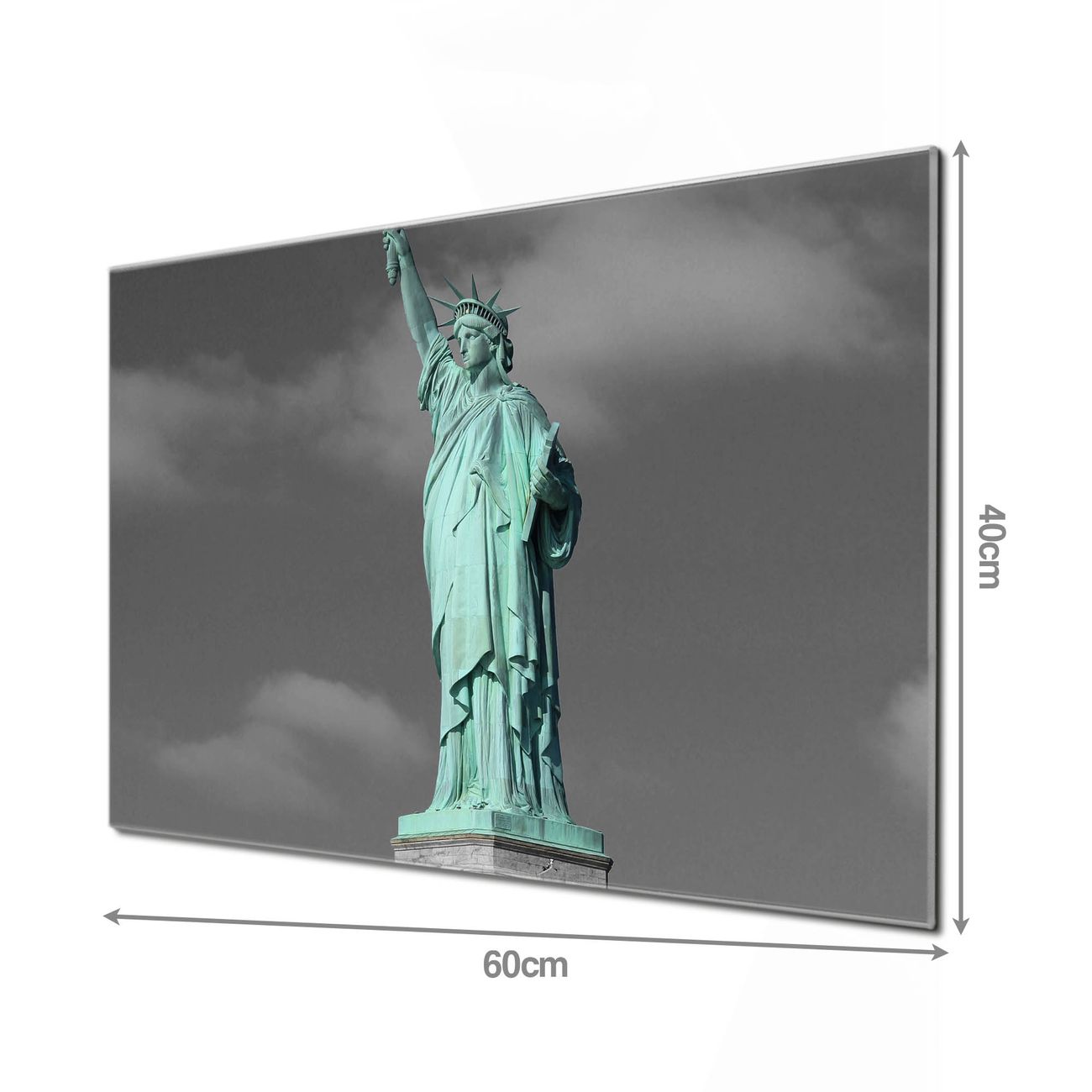 Material: 4mm Sicherheitsglas mit Metallrückwand Eigenschaften: beschreibbar, magnetisch, kratzfest Maße: 60x40x0,6cm, 3,6kg schwer Motiv Nummer 10173 Freiheitsstatue Zubehör: inklusive 4 Neodym-Magnete