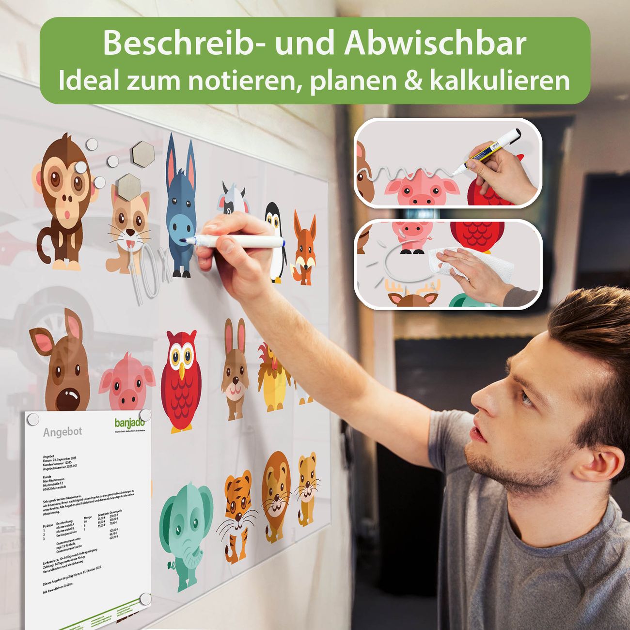 Bitte beachten Sie, dass ausschliessliche spezielle Magnete an der Glastafel haften. Wir empfehlen banjado Neodym Magnete, diese sind durch uns auf Wirksamkeit geprüft.