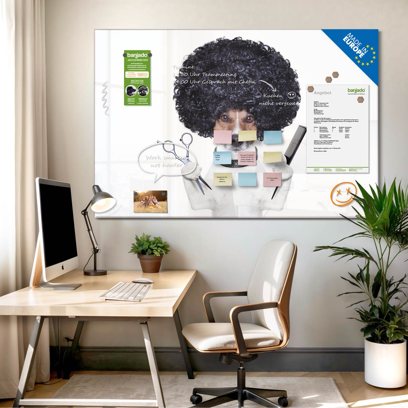 Die banjado Glas Magnettafel mit dem Motiv Motiv Friseur Jack Russel verbindet Funktionalität mit Stil. Sie ersetzt das Zettelchaos durch klare Strukturen und bringt dabei eine warme, natürliche Atmosphäre in Ihr Zuhause. Ob im Büro, in der Küche oder im Eingangsbereich - dieses Design-Board zieht Blicke an und sorgt für Ordnung mit Charakter.