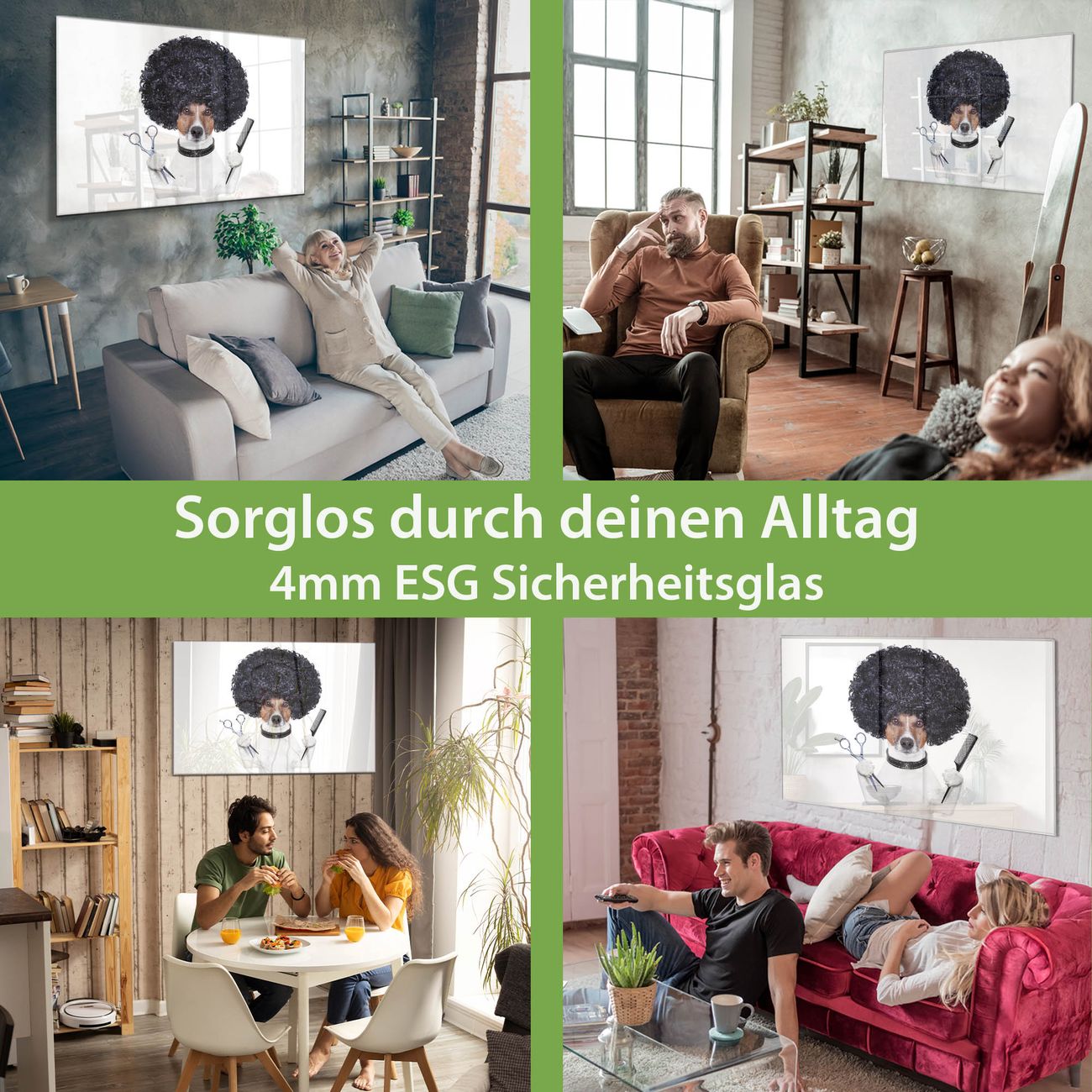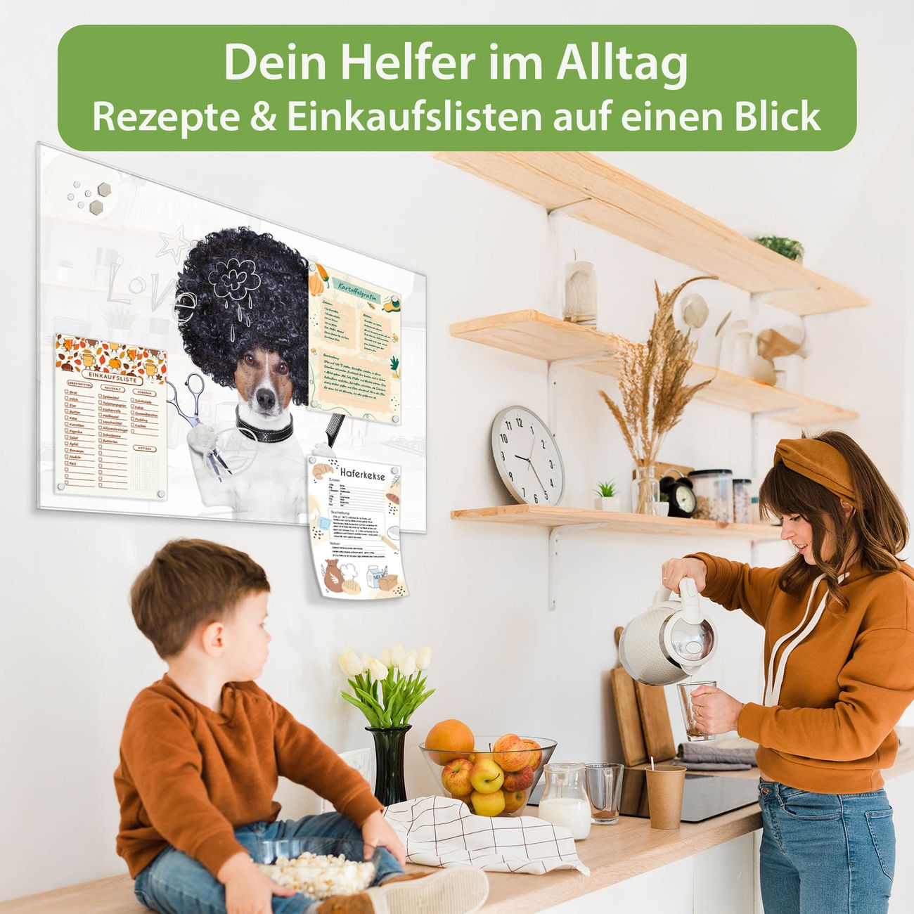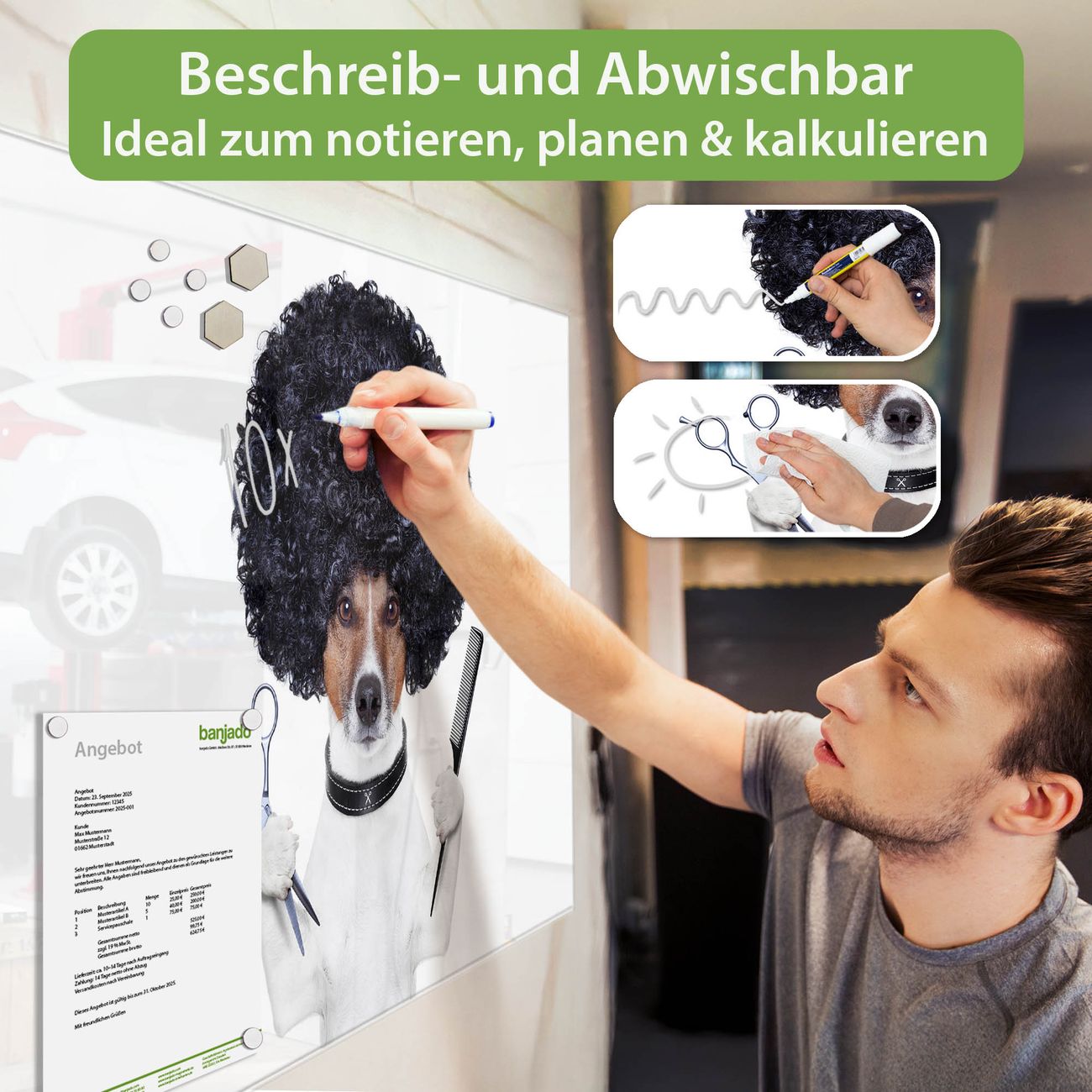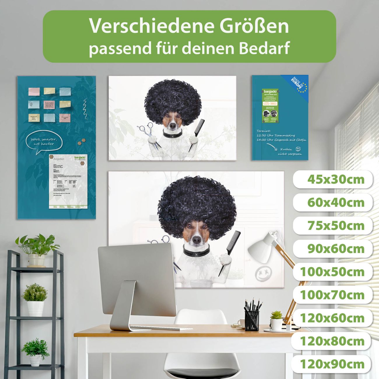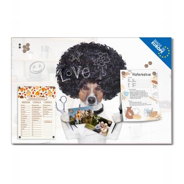 Material: 4mm Sicherheitsglas mit Metallrückwand Eigenschaften: beschreibbar, magnetisch, kratzfest Maße: 75x50x0,6cm, 5,63kg schwer Motiv Nummer 10651 Friseur Jack Russel Zubehör: inklusive 4 Neodym-Magnete