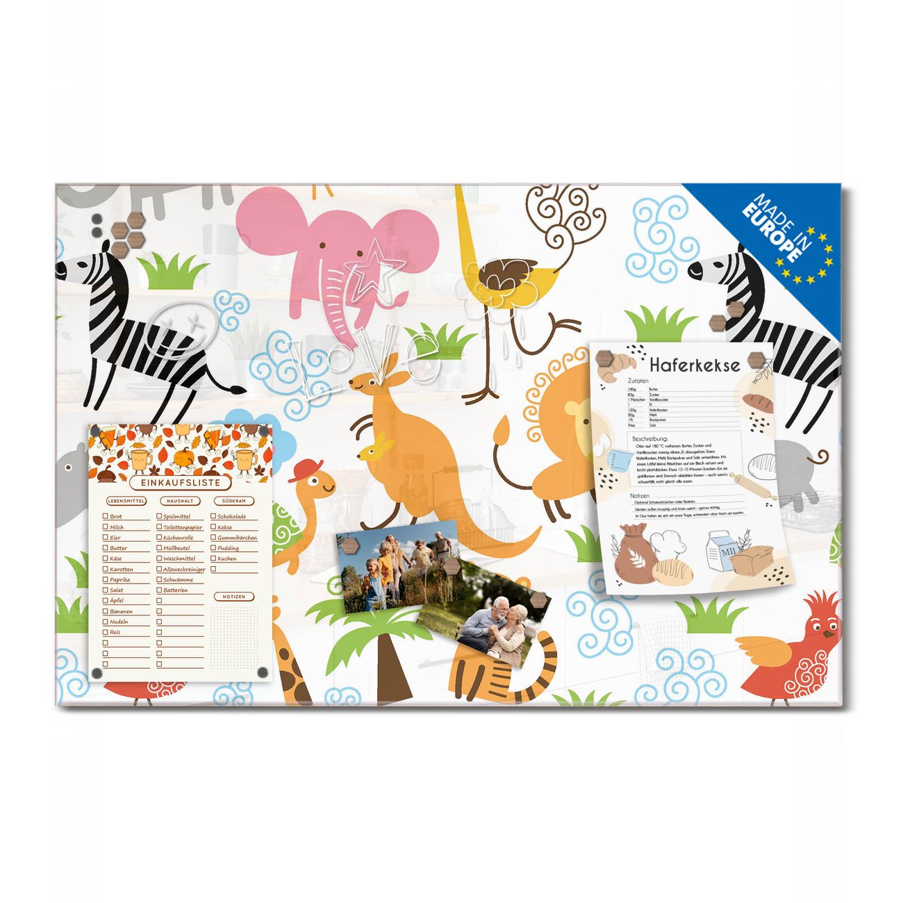 Material: 4mm Sicherheitsglas mit Metallrückwand Eigenschaften: beschreibbar, magnetisch, kratzfest Maße: 75x50x0,6cm, 5,63kg schwer Motiv Nummer 11279 Fröhliche Tiere Zubehör: inklusive 4 Neodym-Magnete