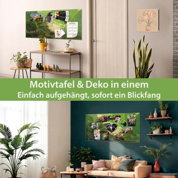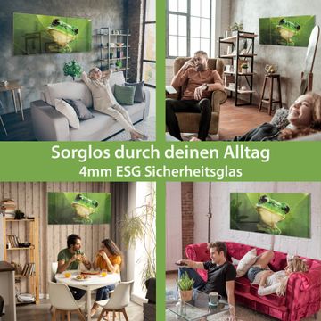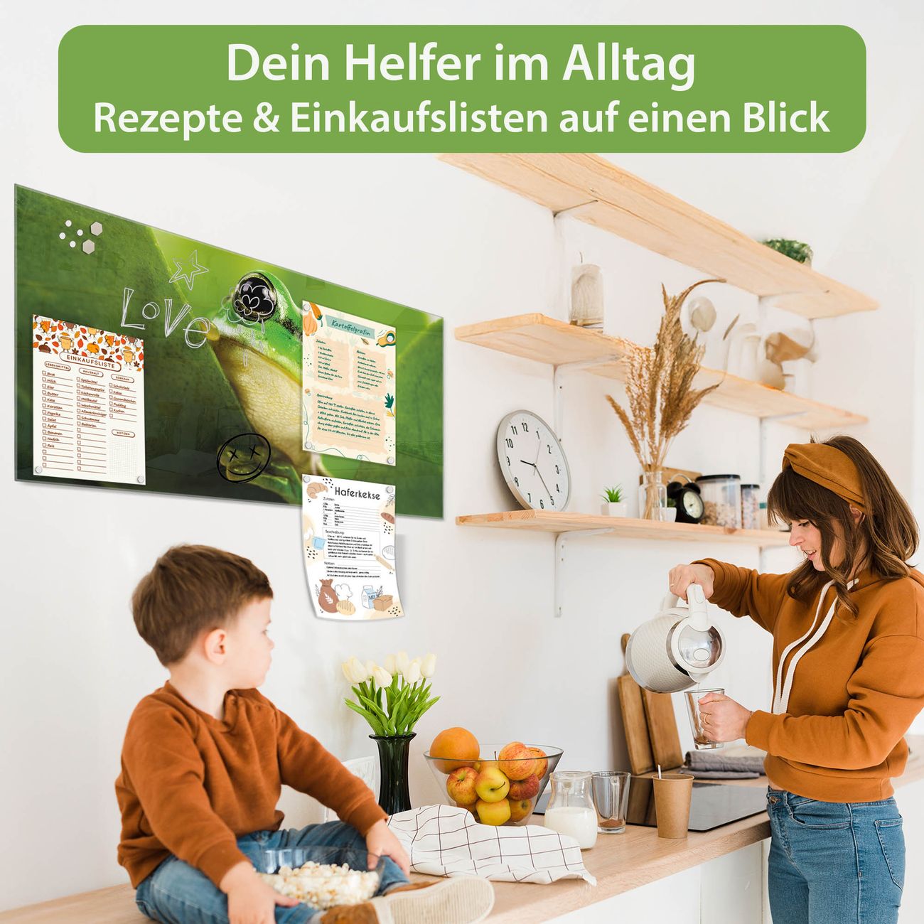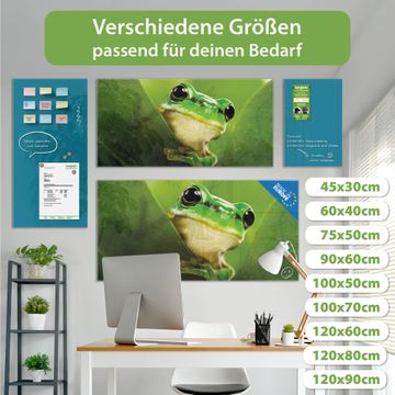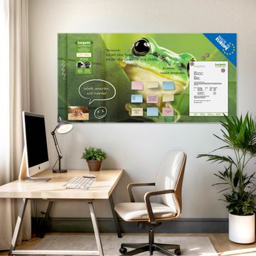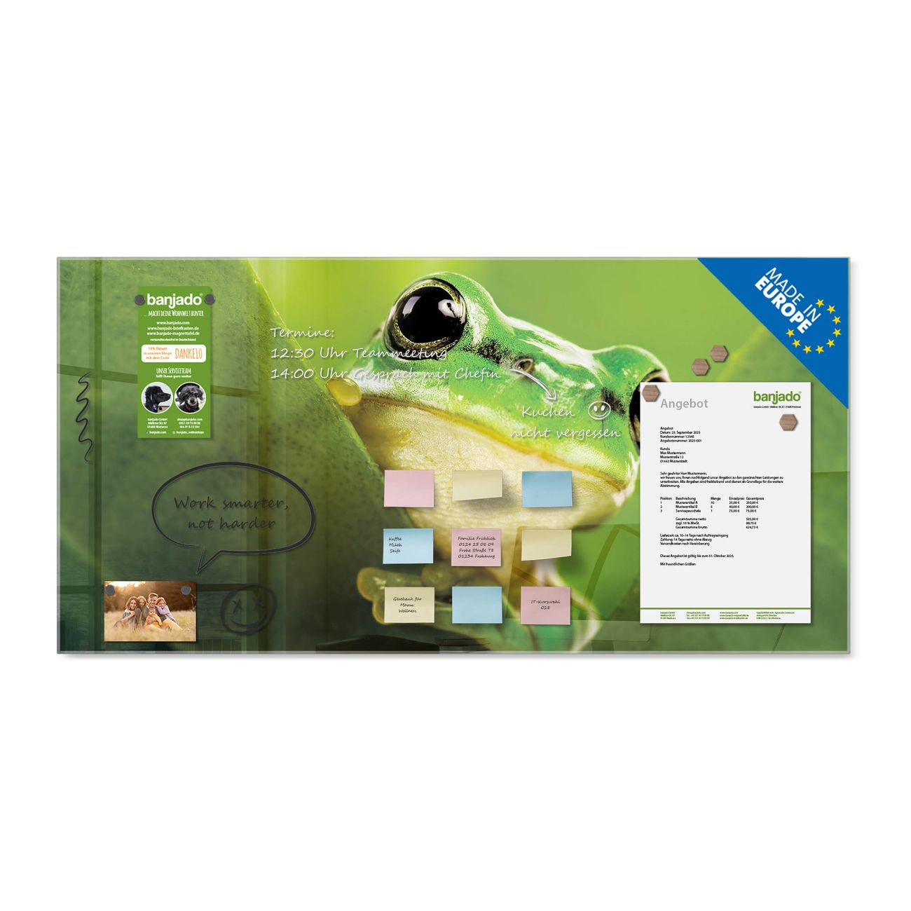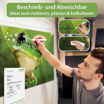 Material: 4mm Sicherheitsglas mit Metallrückwand Eigenschaften: beschreibbar, magnetisch, kratzfest Maße: 120x60x0,6cm, 10,80kg schwer Motiv Nummer 10102 Frosch Zubehör: inklusive 4 Neodym-Magnete