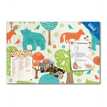 Material: 4mm Sicherheitsglas mit Metallrückwand Eigenschaften: beschreibbar, magnetisch, kratzfest Maße: 45x30x0,6cm, 2,03kg schwer Motiv Nummer 11202 Fuchs Bär Wald Zubehör: inklusive 4 Neodym-Magnete
