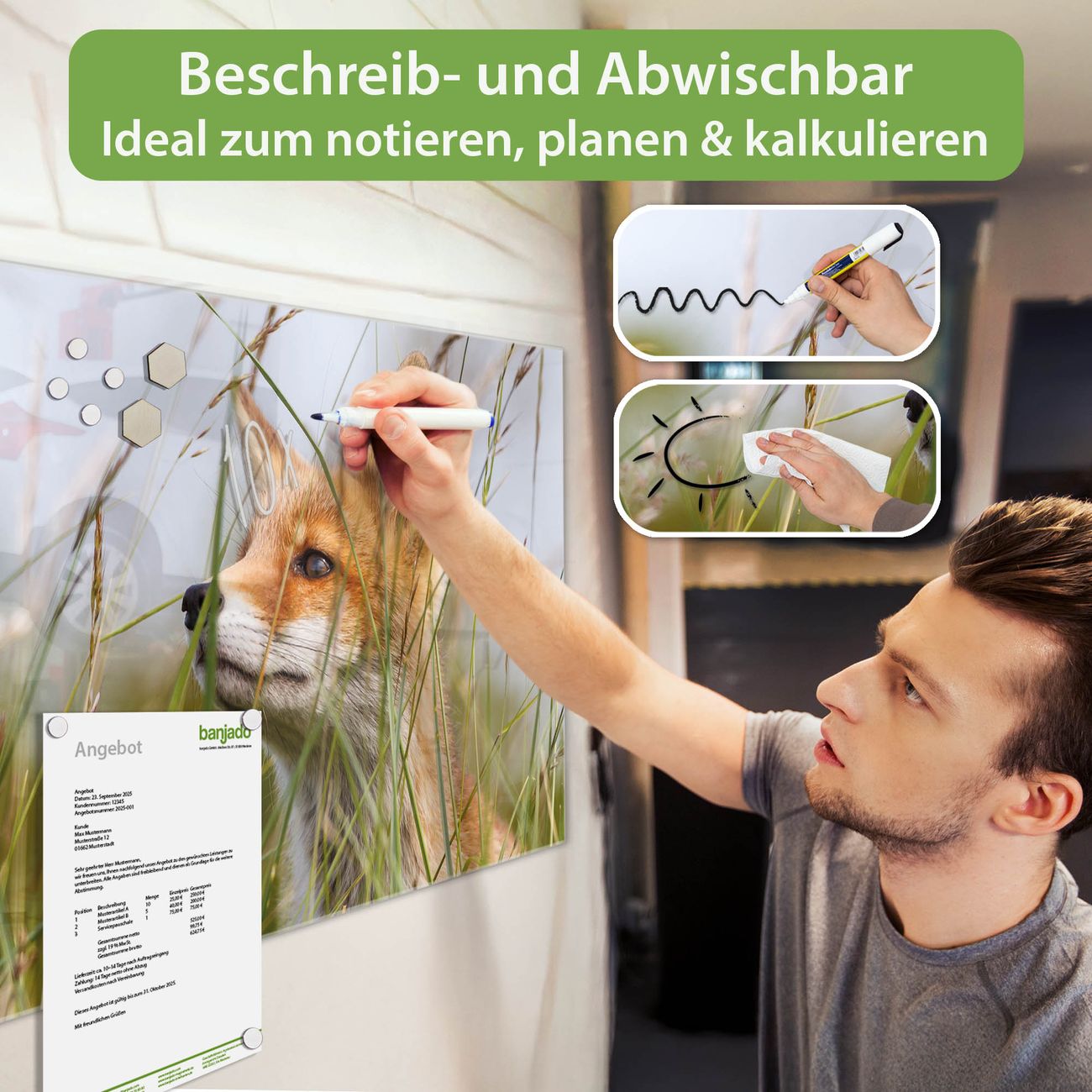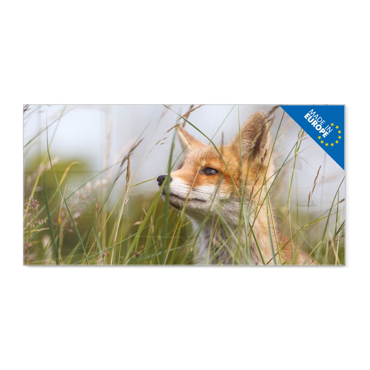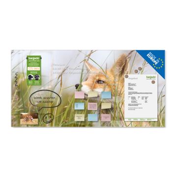 Material: 4mm Sicherheitsglas mit Metallrückwand Eigenschaften: beschreibbar, magnetisch, kratzfest Maße: 100x50x0,6cm, 7,50kg schwer Motiv Nummer 10328 Fuchs Zubehör: inklusive 4 Neodym-Magnete