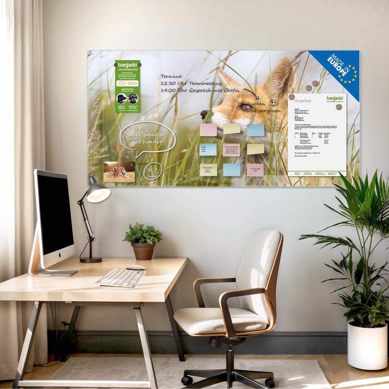 Jede Glas Magnettafel wird in unserer Werkstatt von Hand gefertigt und sorgfältig geprüft. So erhalten Sie ein echtes Qualitätsprodukt, das Funktion und Ästhetik perfekt vereint.?? Warum banjado?