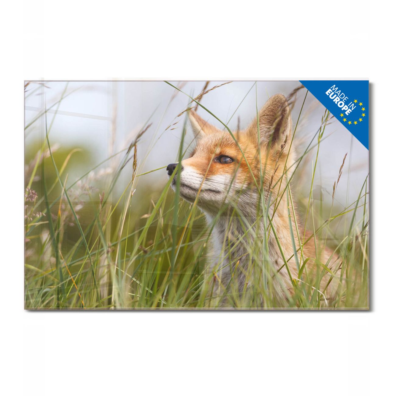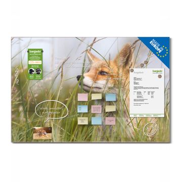 Material: 4mm Sicherheitsglas mit Metallrückwand Eigenschaften: beschreibbar, magnetisch, kratzfest Maße: 90x60x0,6cm, 8,10kg schwer Motiv Nummer 10328 Fuchs Zubehör: inklusive 4 Neodym-Magnete