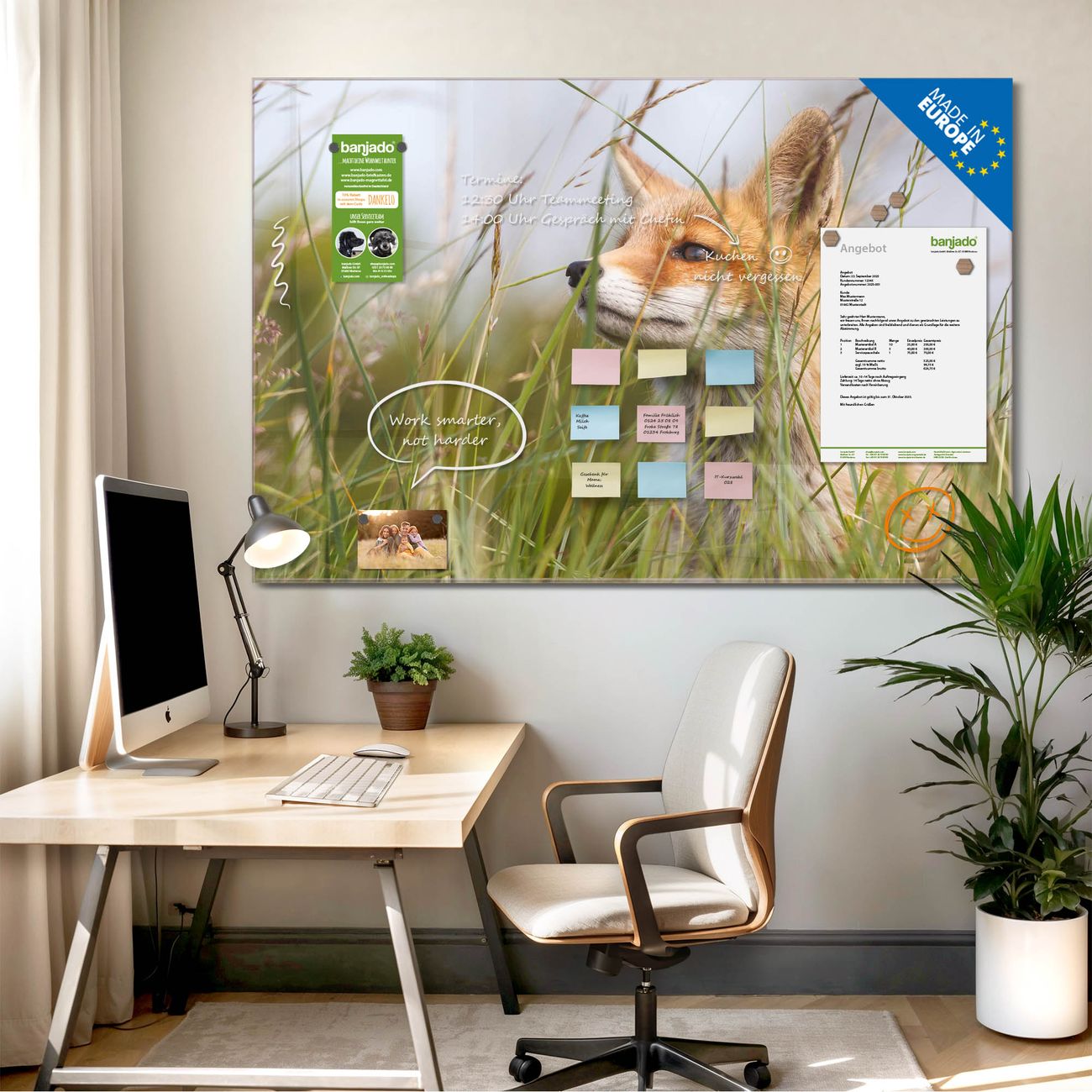 Die banjado Glas Magnettafel mit dem Motiv Motiv Fuchs verbindet Funktionalität mit Stil. Sie ersetzt das Zettelchaos durch klare Strukturen und bringt dabei eine warme, natürliche Atmosphäre in Ihr Zuhause. Ob im Büro, in der Küche oder im Eingangsbereich - dieses Design-Board zieht Blicke an und sorgt für Ordnung mit Charakter.