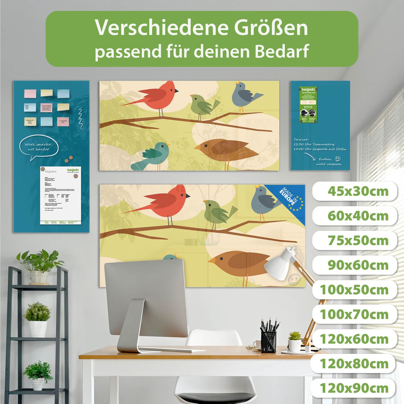 Material: 4mm Sicherheitsglas mit Metallrückwand Eigenschaften: beschreibbar, magnetisch, kratzfest Maße: 100x50x0,6cm, 7,50kg schwer Motiv Nummer 10890 Fünf Vögel Zubehör: inklusive 4 Neodym-Magnete