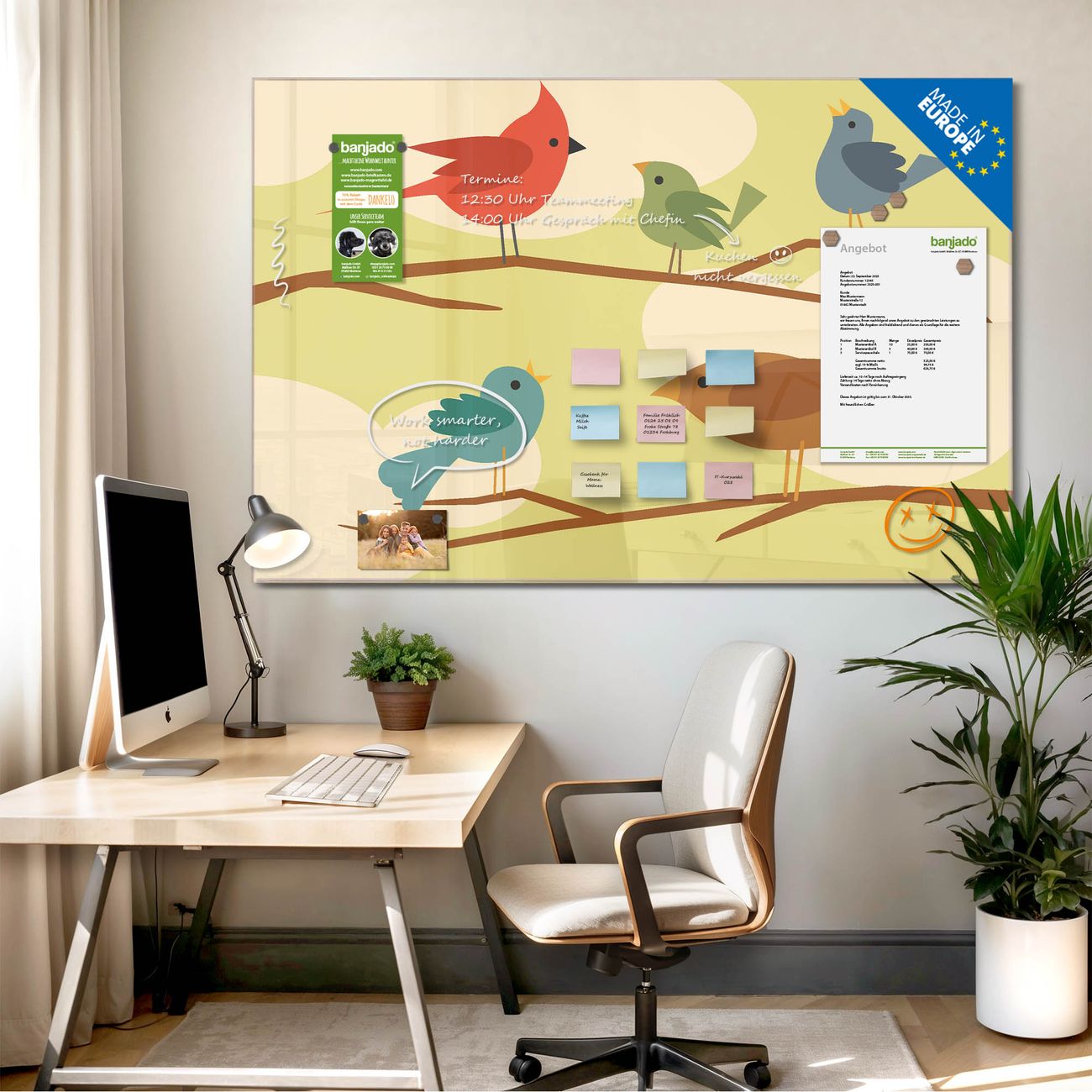 Die banjado Glas Magnettafel mit dem Motiv Motiv Fünf Vögel verbindet Funktionalität mit Stil. Sie ersetzt das Zettelchaos durch klare Strukturen und bringt dabei eine warme, natürliche Atmosphäre in Ihr Zuhause. Ob im Büro, in der Küche oder im Eingangsbereich - dieses Design-Board zieht Blicke an und sorgt für Ordnung mit Charakter.
