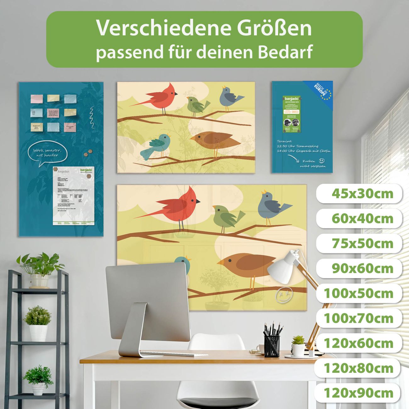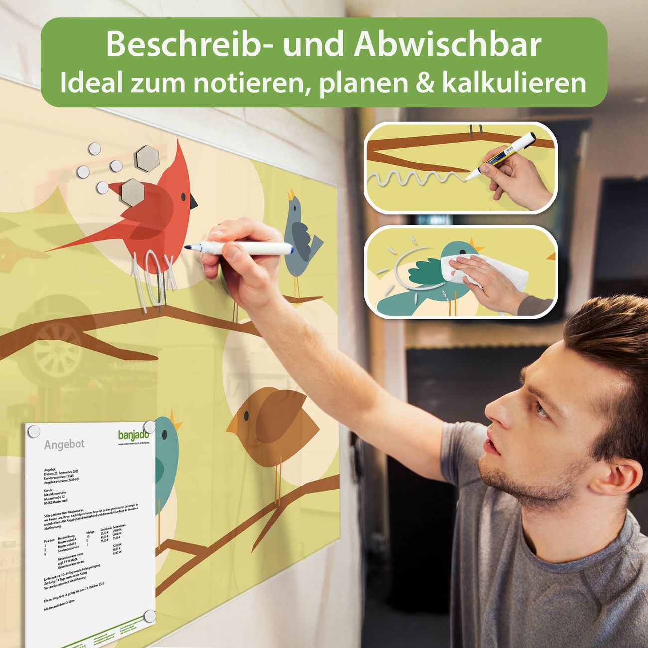 Material: 4mm Sicherheitsglas mit Metallrückwand Eigenschaften: beschreibbar, magnetisch, kratzfest Maße: 75x50x0,6cm, 5,63kg schwer Motiv Nummer 10890 Fünf Vögel Zubehör: inklusive 4 Neodym-Magnete