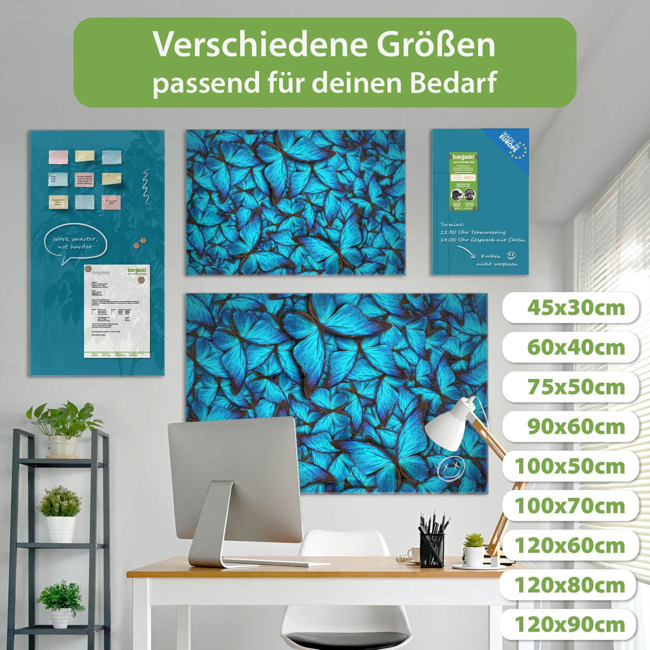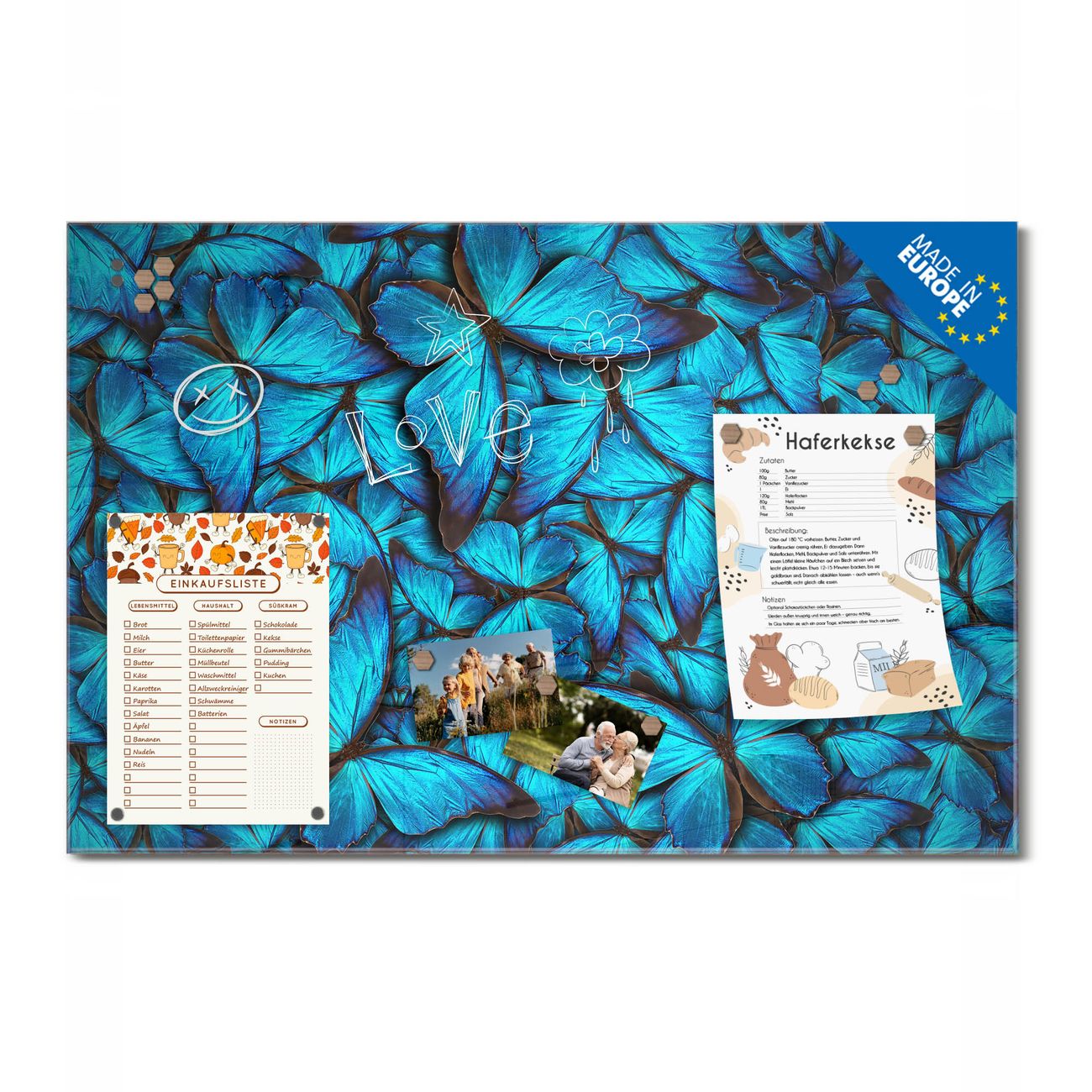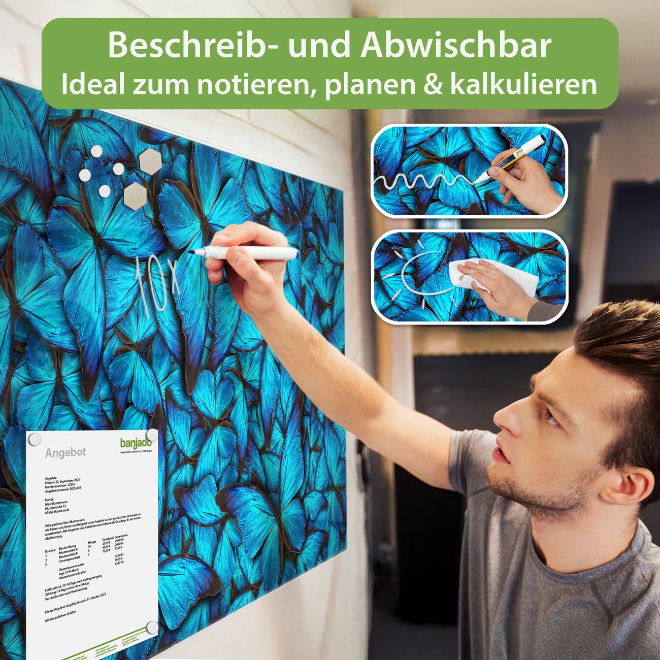 Material: 4mm Sicherheitsglas mit Metallrückwand Eigenschaften: beschreibbar, magnetisch, kratzfest Maße: 45x30x0,6cm, 2,03kg schwer Motiv Nummer 10726 Fürstliche Falter Zubehör: inklusive 4 Neodym-Magnete