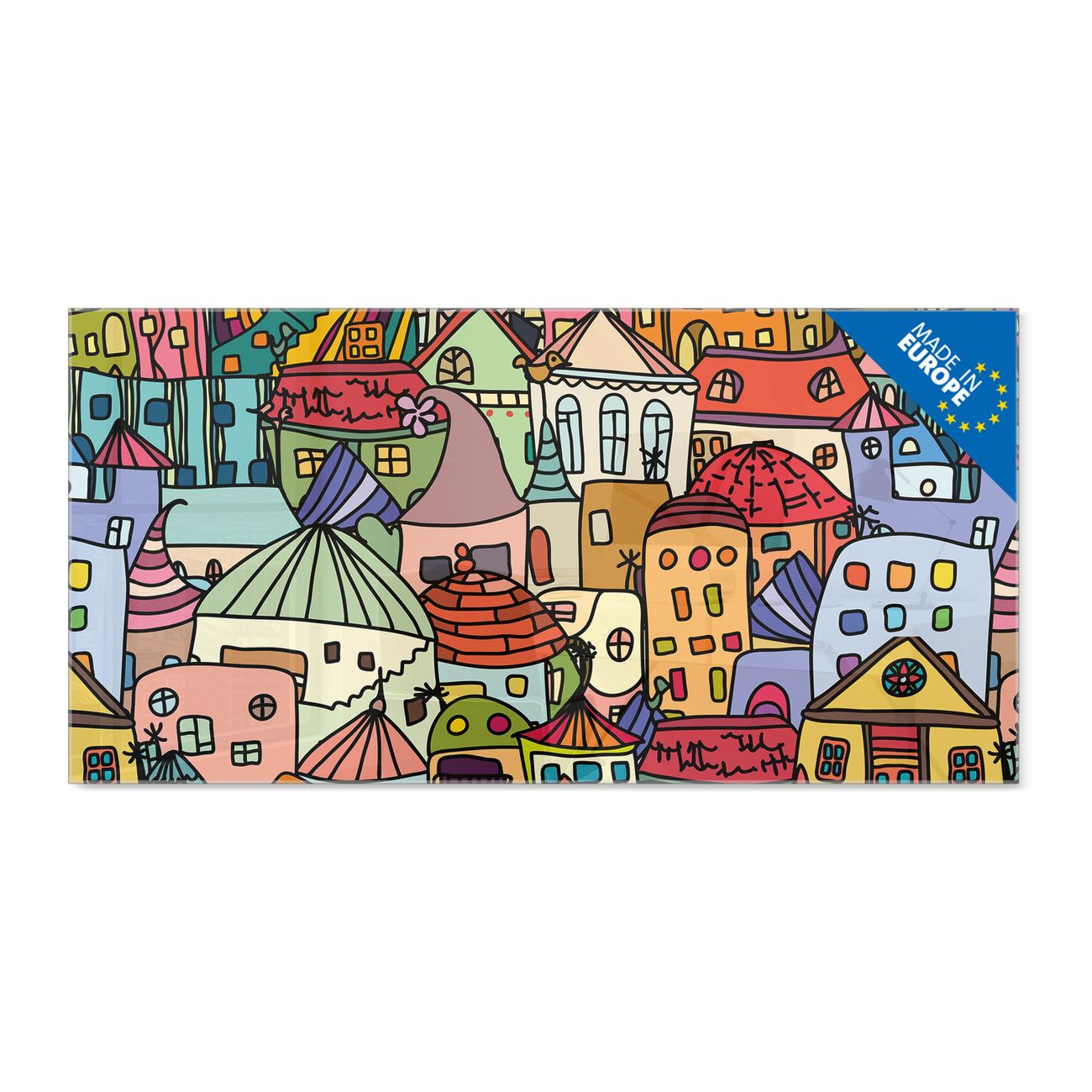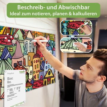 Material: 4mm Sicherheitsglas mit Metallrückwand Eigenschaften: beschreibbar, magnetisch, kratzfest Maße: 100x50x0,6cm, 7,50kg schwer Motiv Nummer 10864 Funky Town Zubehör: inklusive 4 Neodym-Magnete