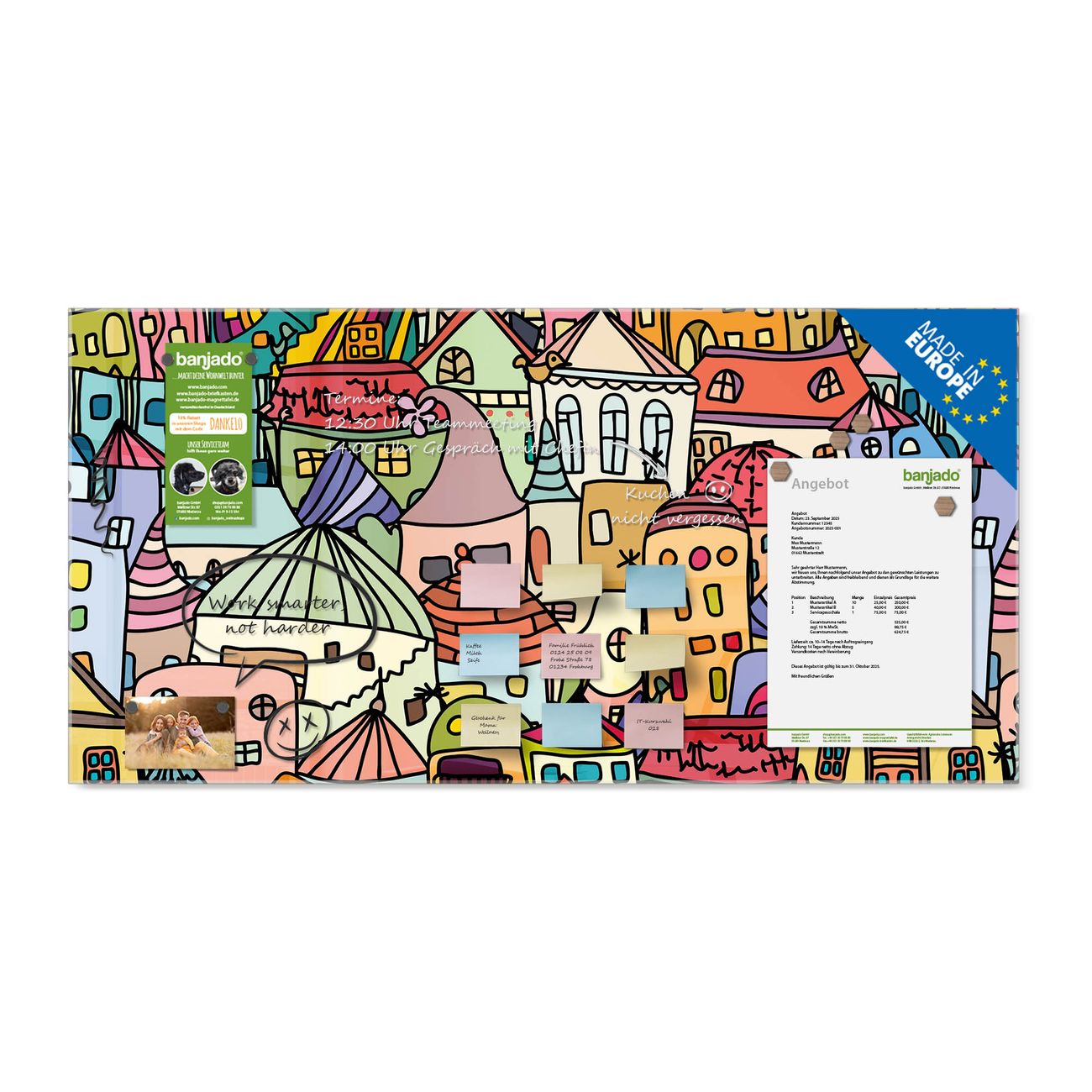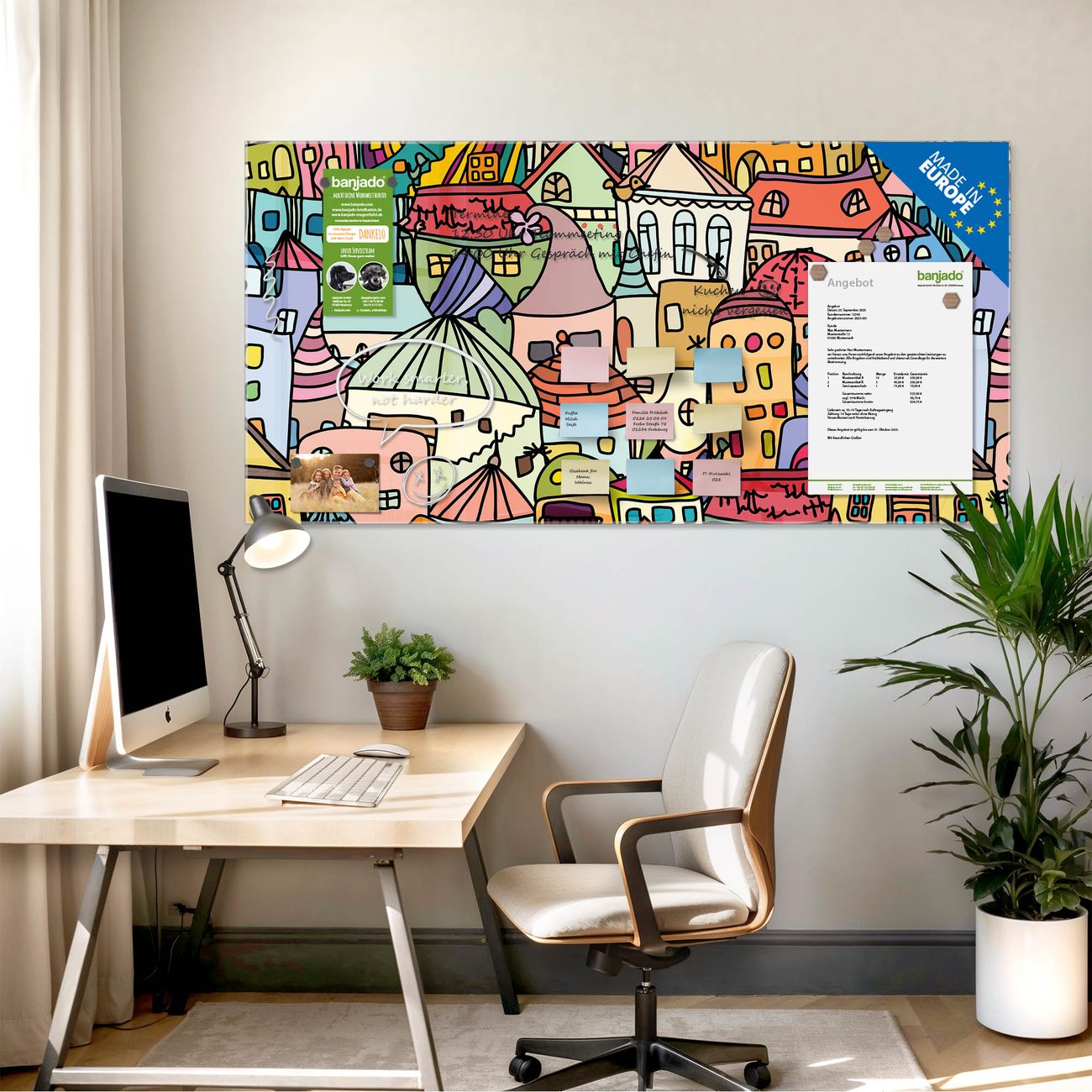 Jede Glas Magnettafel wird in unserer Werkstatt von Hand gefertigt und sorgfältig geprüft. So erhalten Sie ein echtes Qualitätsprodukt, das Funktion und Ästhetik perfekt vereint.?? Warum banjado?
