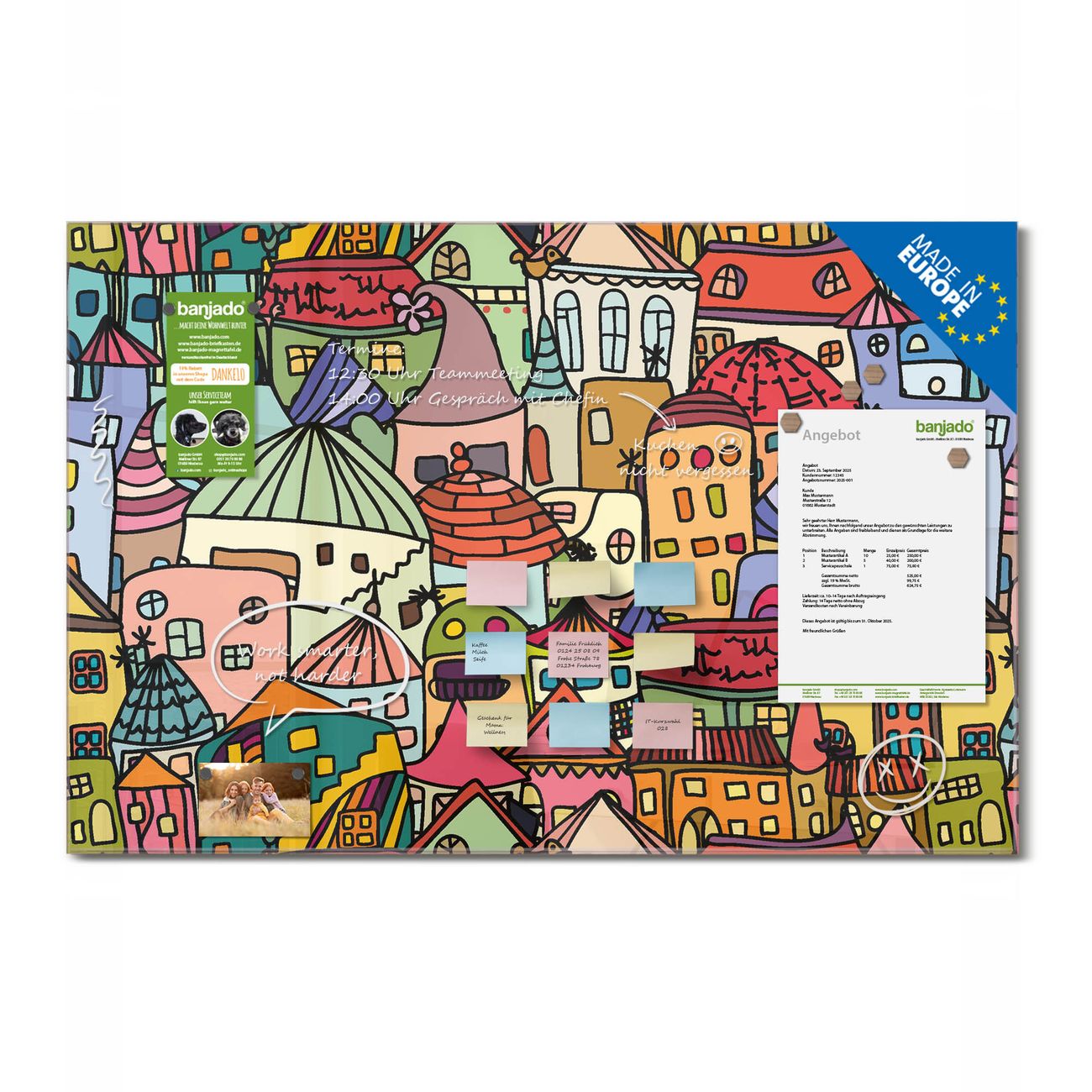 Material: 4mm Sicherheitsglas mit Metallrückwand Eigenschaften: beschreibbar, magnetisch, kratzfest Maße: 90x60x0,6cm, 8,10kg schwer Motiv Nummer 10864 Funky Town Zubehör: inklusive 4 Neodym-Magnete