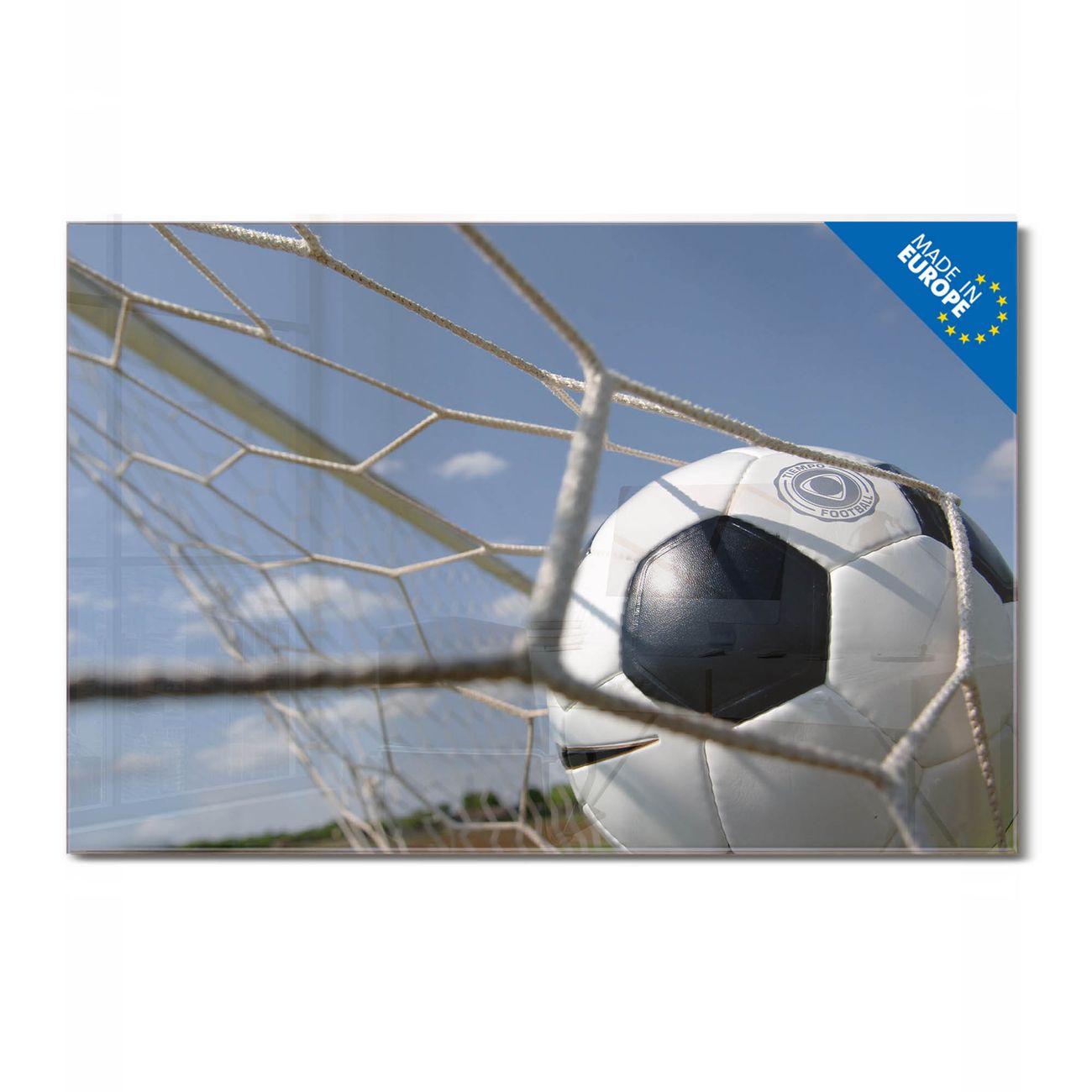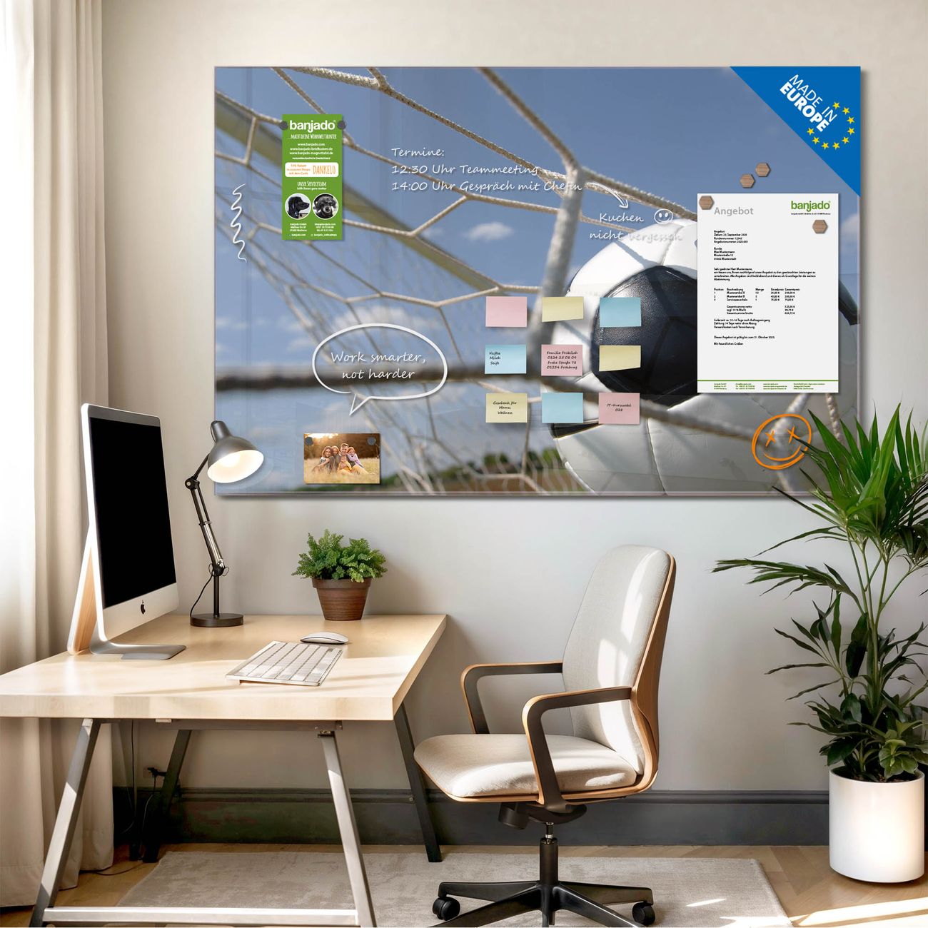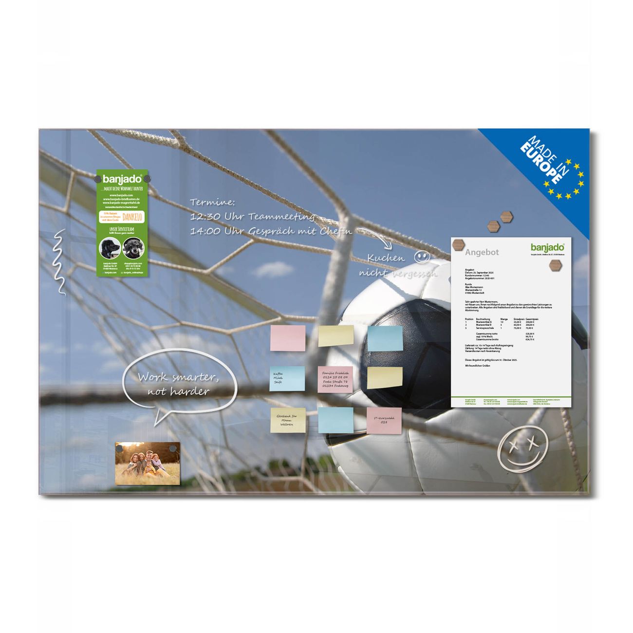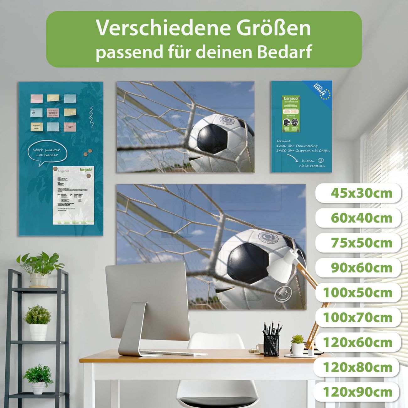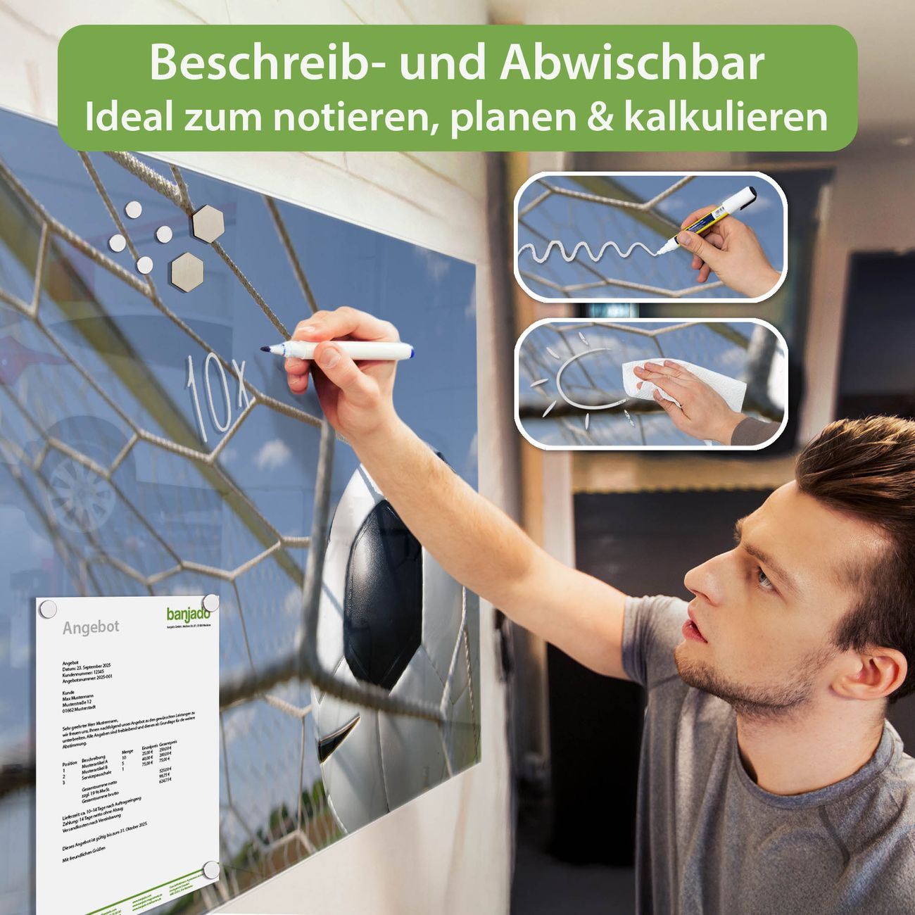 Material: 4mm Sicherheitsglas mit Metallrückwand Eigenschaften: beschreibbar, magnetisch, kratzfest Maße: 120x80x0,6cm, 14,40kg schwer Motiv Nummer 10097 Fußball Zubehör: inklusive 4 Neodym-Magnete