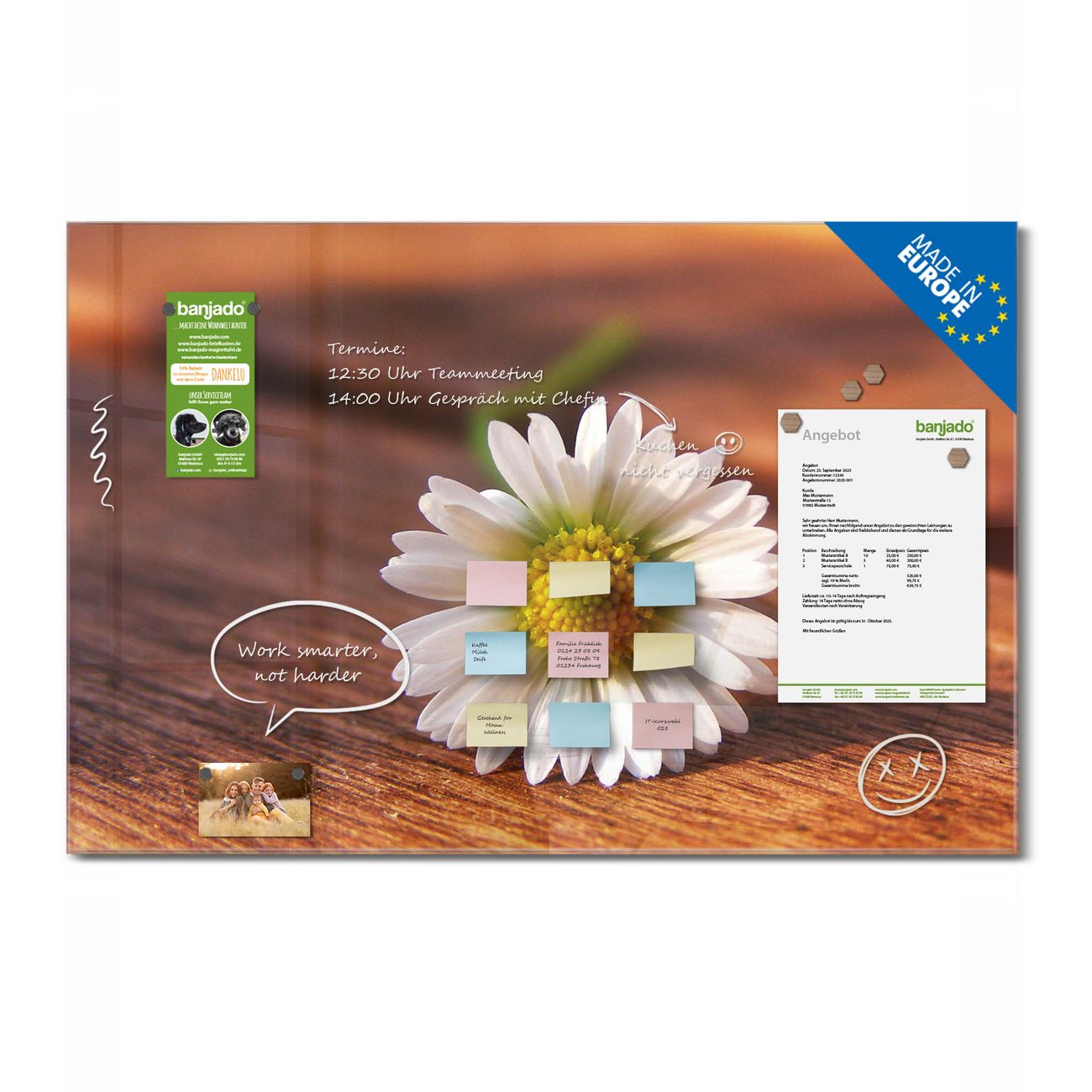 Jede Glas Magnettafel wird in unserer Werkstatt von Hand gefertigt und sorgfältig geprüft. So erhalten Sie ein echtes Qualitätsprodukt, das Funktion und Ästhetik perfekt vereint.?? Warum banjado?