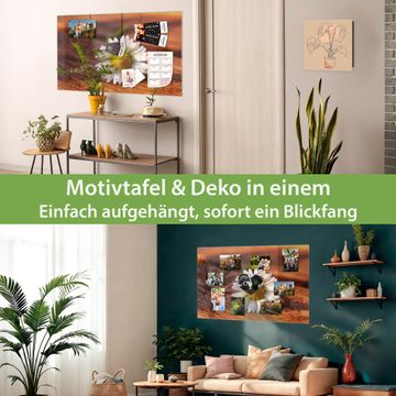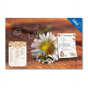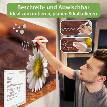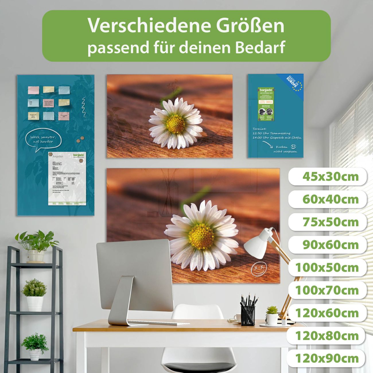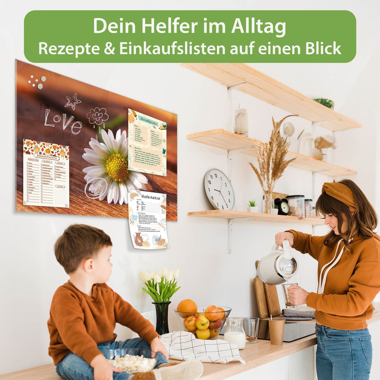 Material: 4mm Sicherheitsglas mit Metallrückwand Eigenschaften: beschreibbar, magnetisch, kratzfest Maße: 45x30x0,6cm, 2,03kg schwer Motiv Nummer 10081 Gänseblümchen Zubehör: inklusive 4 Neodym-Magnete