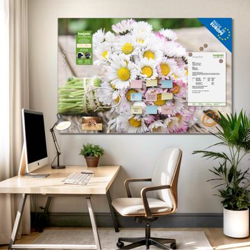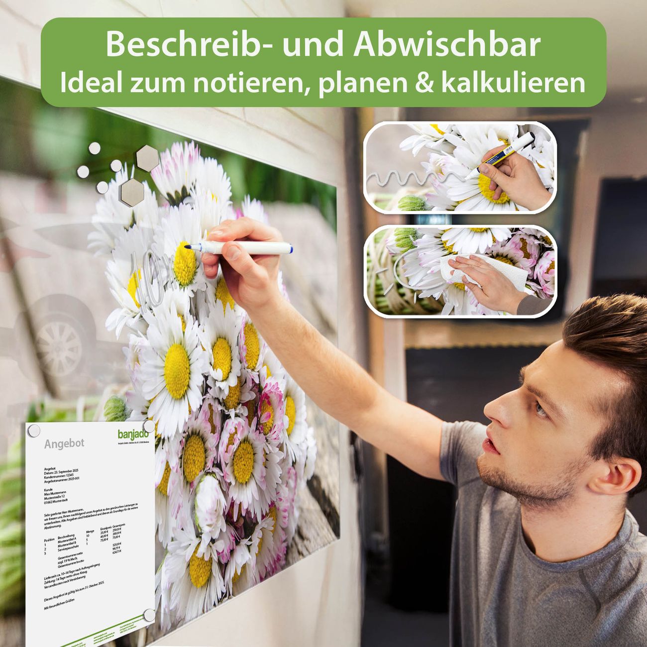 Material: 4mm Sicherheitsglas mit Metallrückwand Eigenschaften: beschreibbar, magnetisch, kratzfest Maße: 120x80x0,6cm, 14,40kg schwer Motiv Nummer 10536 Strauß Gänseblümchen Zubehör: inklusive 4 Neodym-Magnete