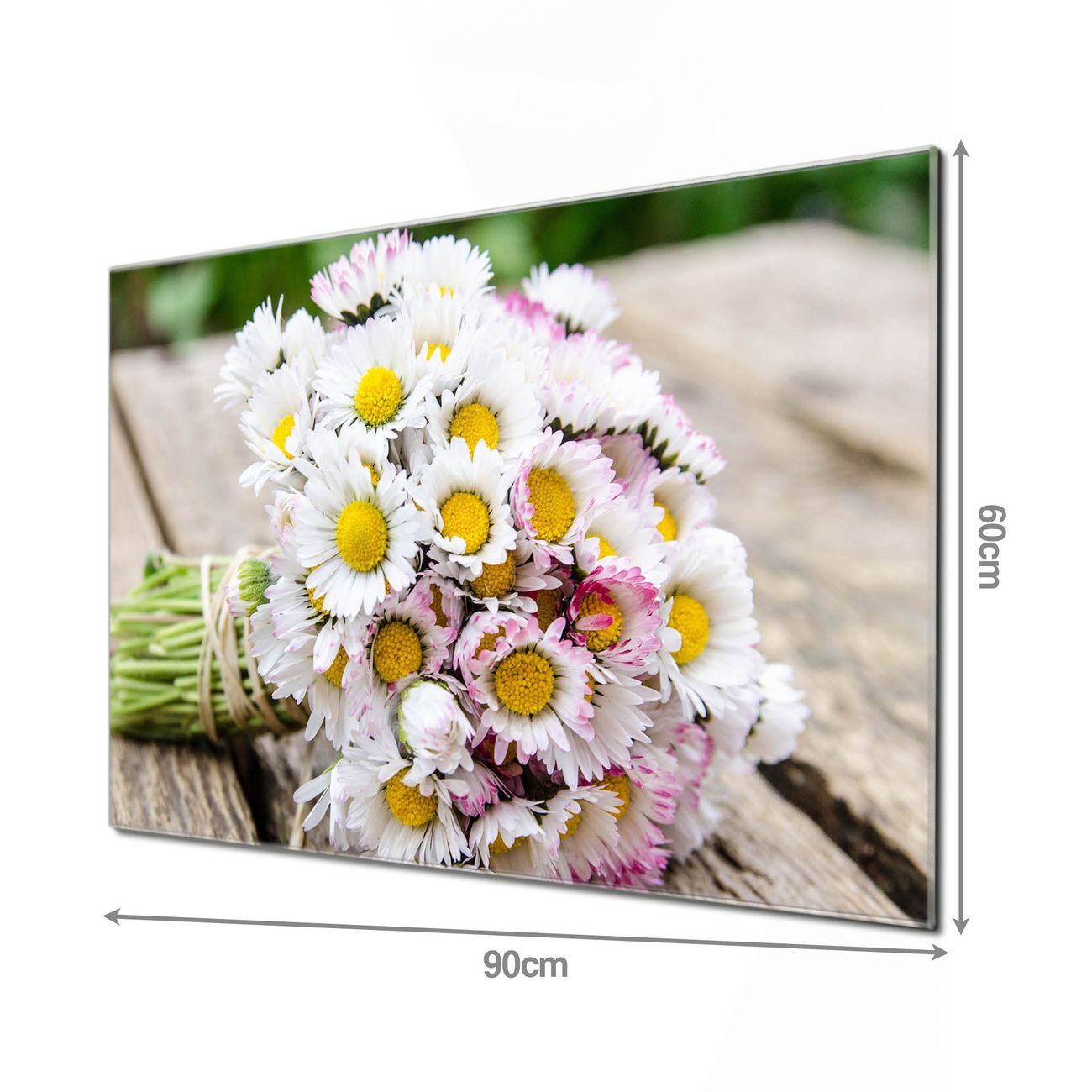 Material: 4mm Sicherheitsglas mit Metallrückwand Eigenschaften: beschreibbar, magnetisch, kratzfest Maße: 90x60x0,6cm, 8,10kg schwer Motiv Nummer 10536 Strauß Gänseblümchen Zubehör: inklusive 4 Neodym-Magnete