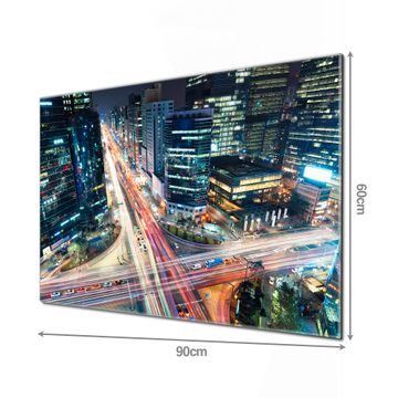 Material: 4mm Sicherheitsglas mit Metallrückwand Eigenschaften: beschreibbar, magnetisch, kratzfest Maße: 90x60x0,6cm, 8,10kg schwer Motiv Nummer 12420 Gangnam Bei Nacht Zubehör: inklusive 4 Neodym-Magnete