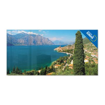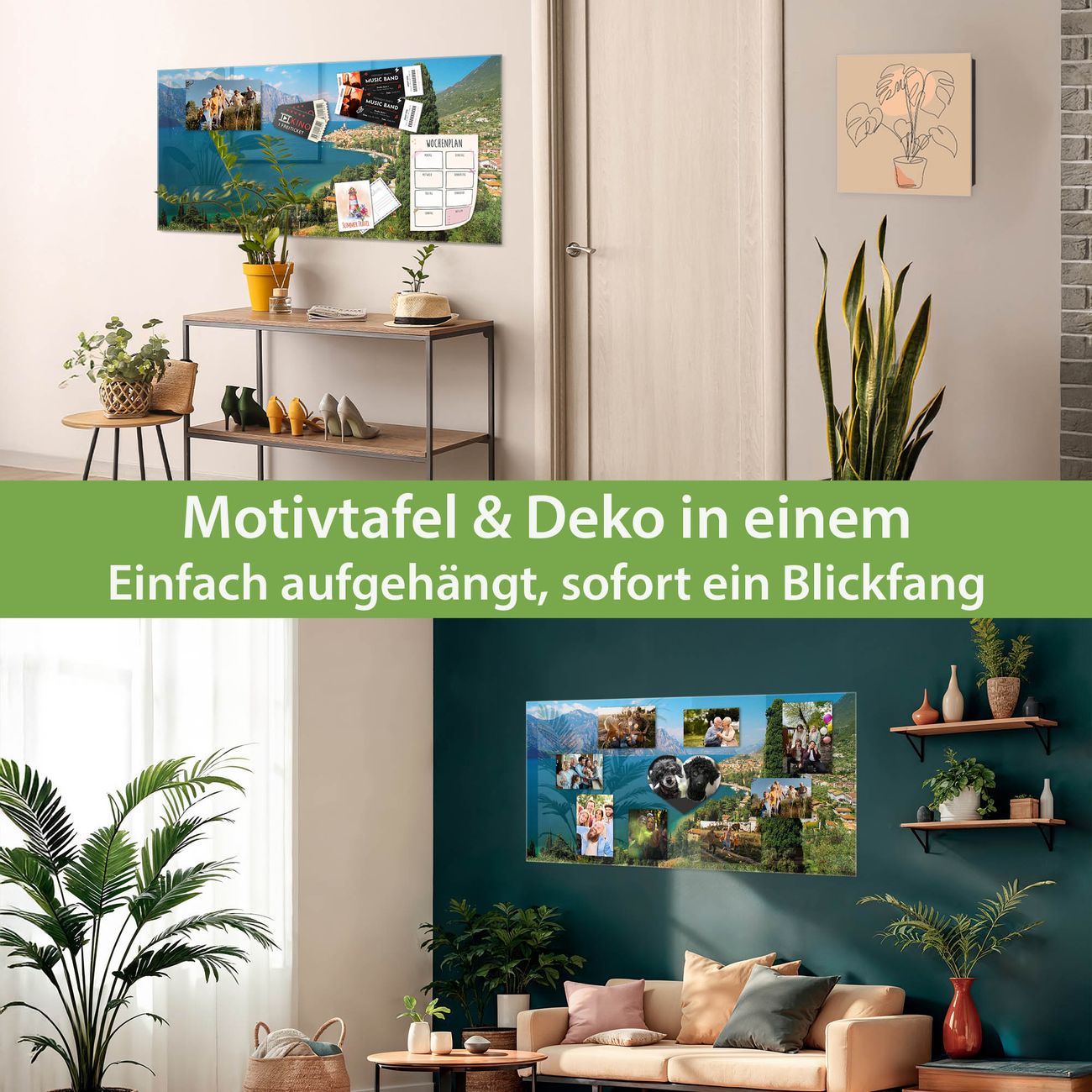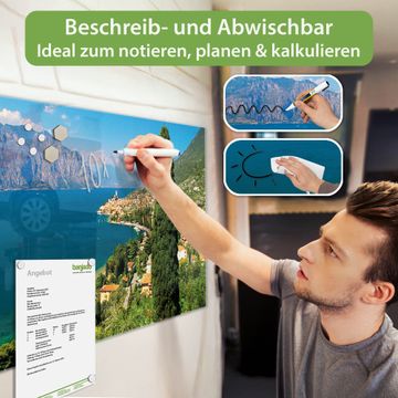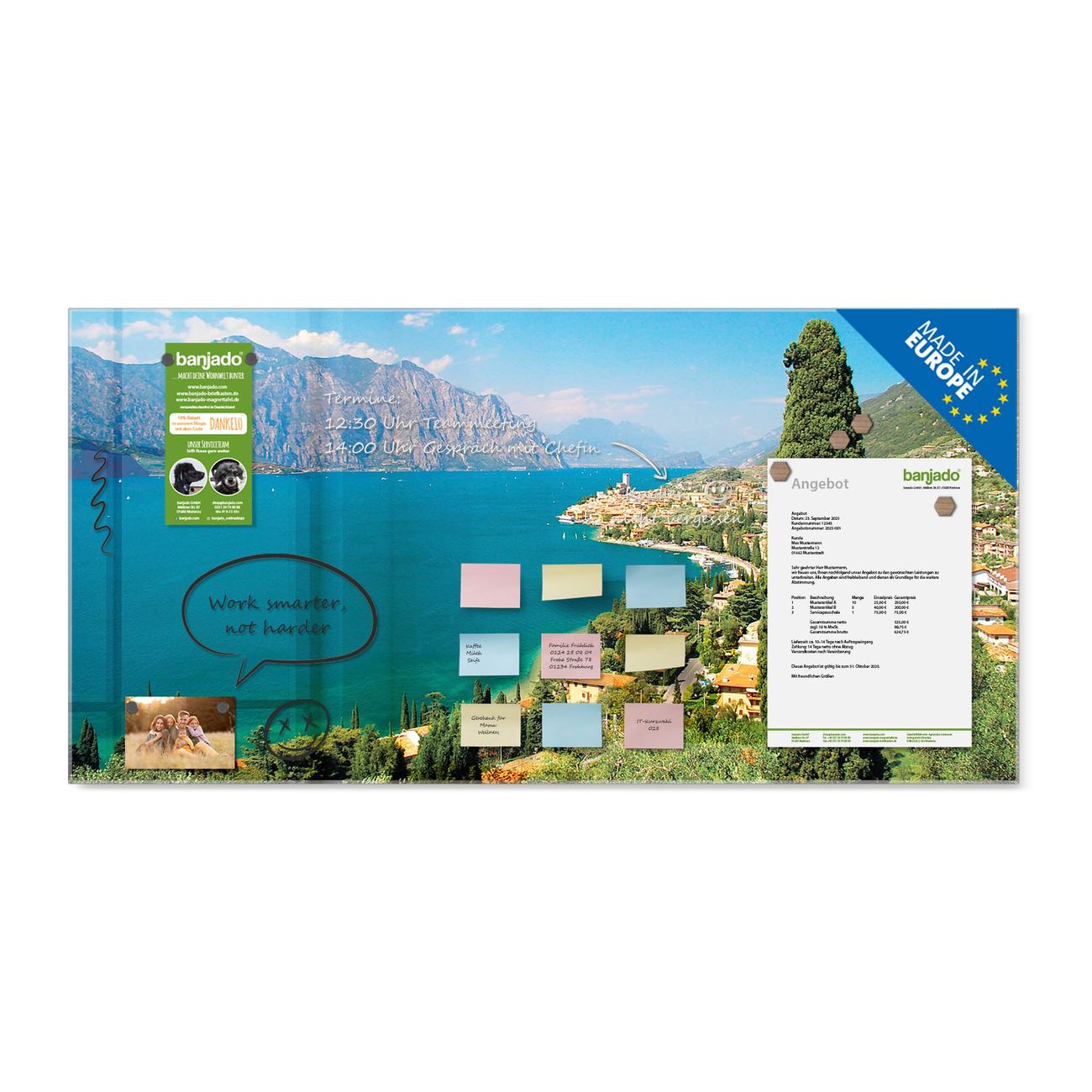 Material: 4mm Sicherheitsglas mit Metallrückwand Eigenschaften: beschreibbar, magnetisch, kratzfest Maße: 100x50x0,6cm, 7,50kg schwer Motiv Nummer 10009 Gardasee Zubehör: inklusive 4 Neodym-Magnete