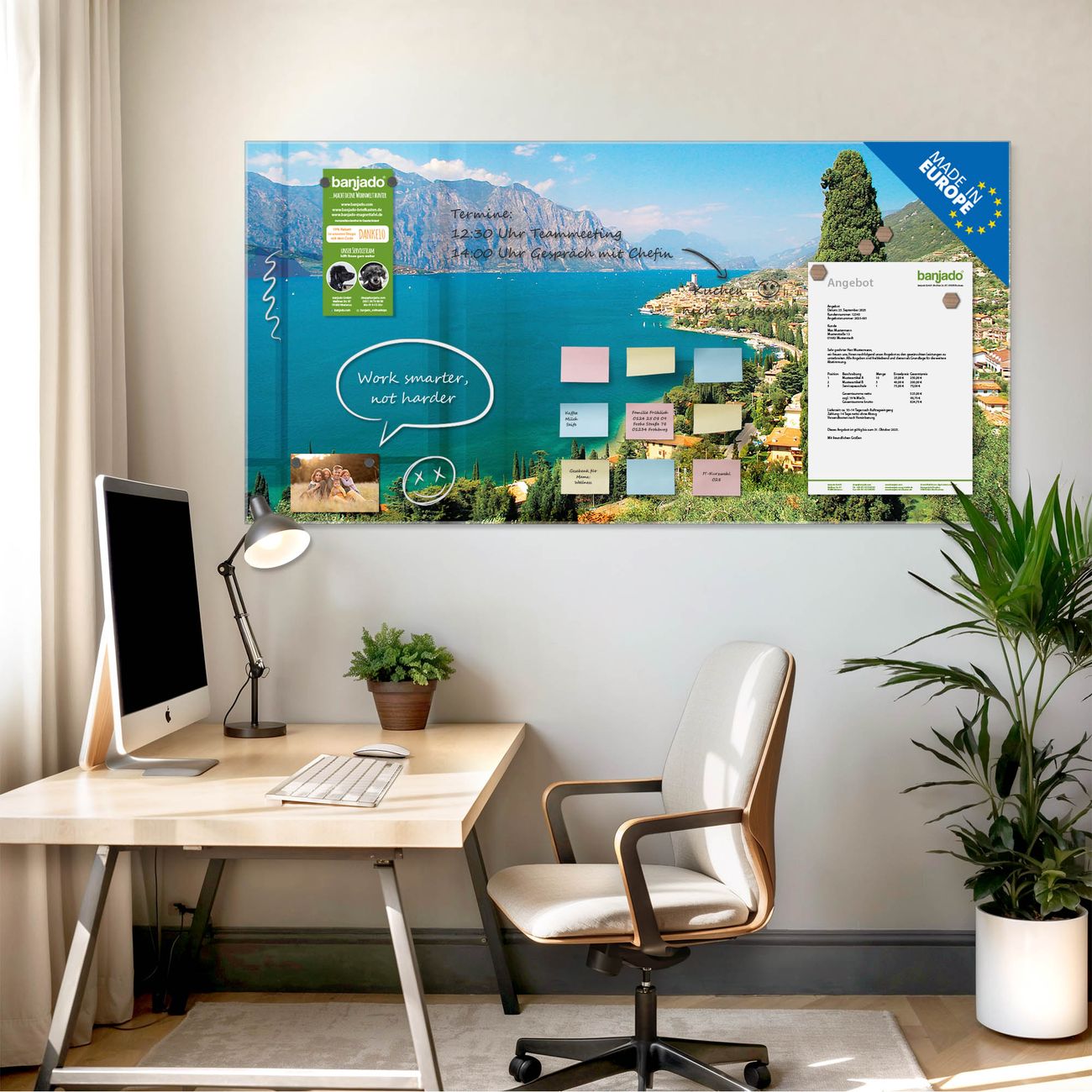 Die banjado Glas Magnettafel mit dem Motiv Motiv Gardasee verbindet Funktionalität mit Stil. Sie ersetzt das Zettelchaos durch klare Strukturen und bringt dabei eine warme, natürliche Atmosphäre in Ihr Zuhause. Ob im Büro, in der Küche oder im Eingangsbereich - dieses Design-Board zieht Blicke an und sorgt für Ordnung mit Charakter.
