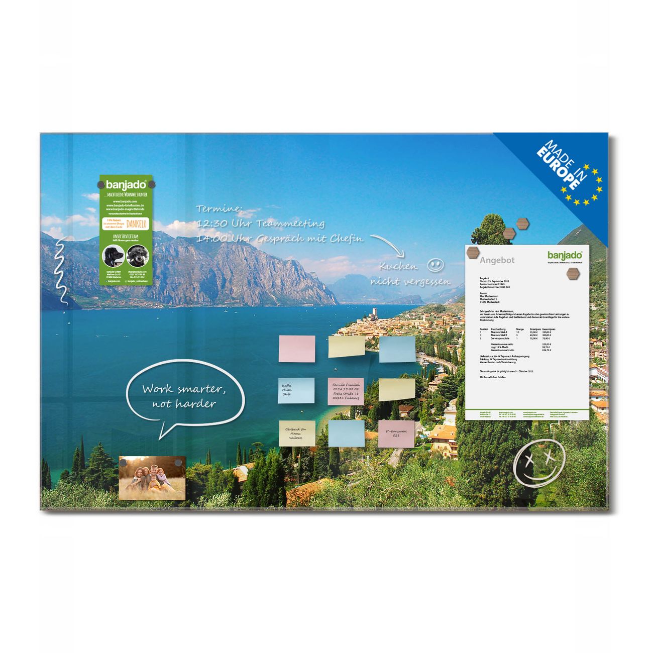 Jede Glas Magnettafel wird in unserer Werkstatt von Hand gefertigt und sorgfältig geprüft. So erhalten Sie ein echtes Qualitätsprodukt, das Funktion und Ästhetik perfekt vereint.?? Warum banjado?