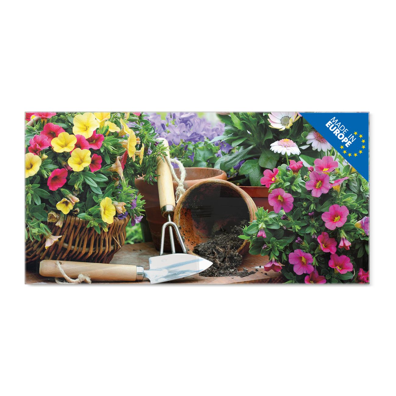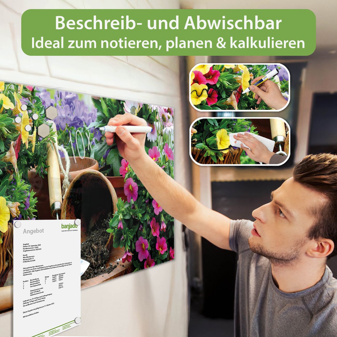 Material: 4mm Sicherheitsglas mit Metallrückwand Eigenschaften: beschreibbar, magnetisch, kratzfest Maße: 120x60x0,6cm, 10,80kg schwer Motiv Nummer 10226 Gartenfreude Zubehör: inklusive 4 Neodym-Magnete