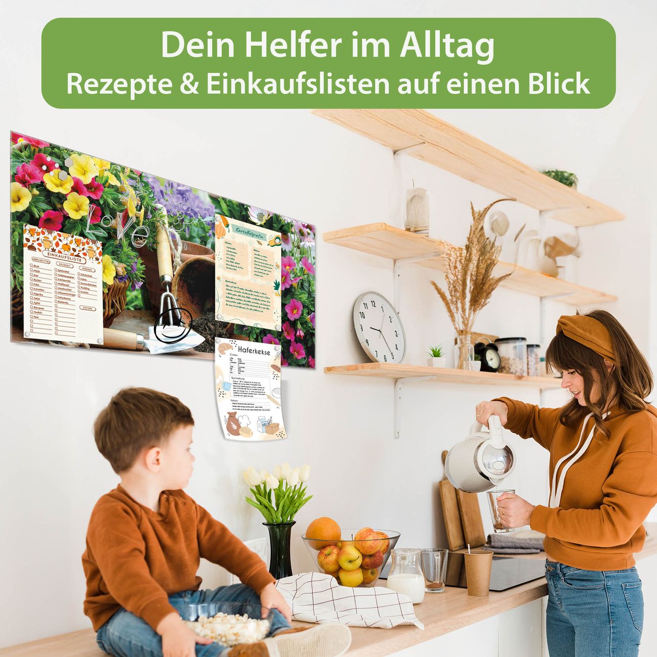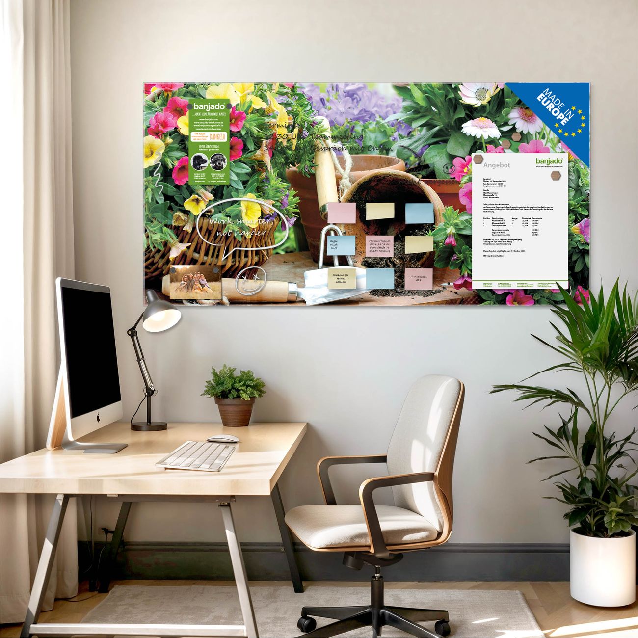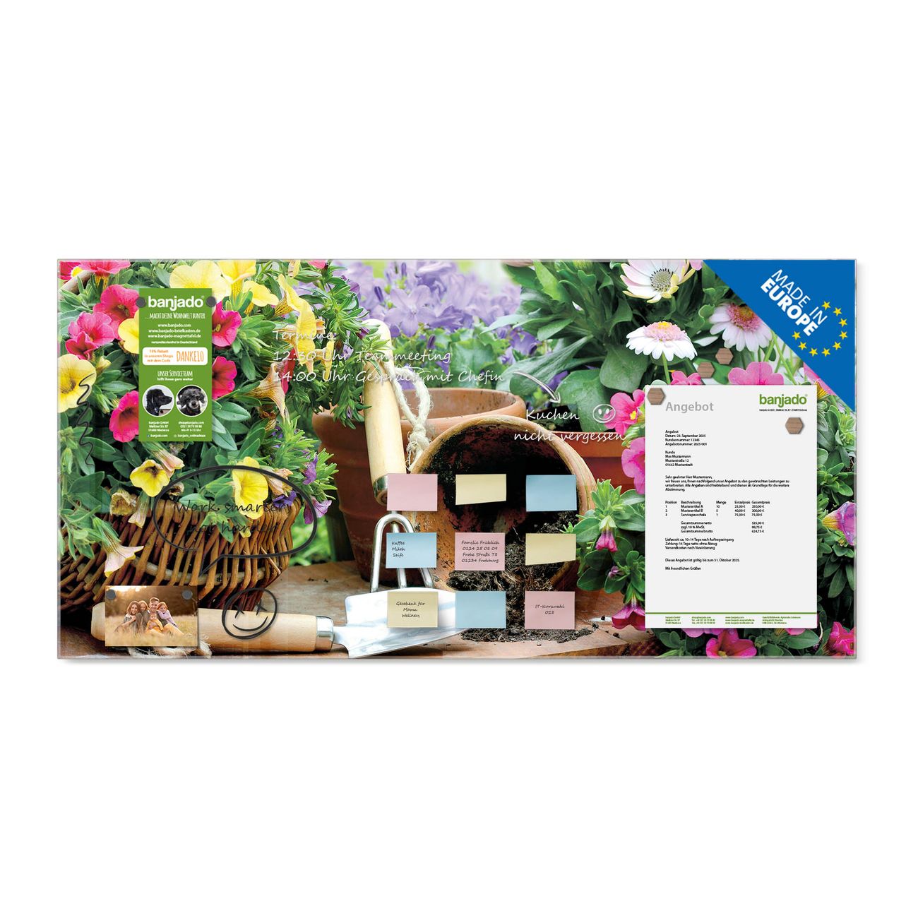 Die banjado Glas Magnettafel mit dem Motiv Motiv Gartenfreude verbindet Funktionalität mit Stil. Sie ersetzt das Zettelchaos durch klare Strukturen und bringt dabei eine warme, natürliche Atmosphäre in Ihr Zuhause. Ob im Büro, in der Küche oder im Eingangsbereich - dieses Design-Board zieht Blicke an und sorgt für Ordnung mit Charakter.