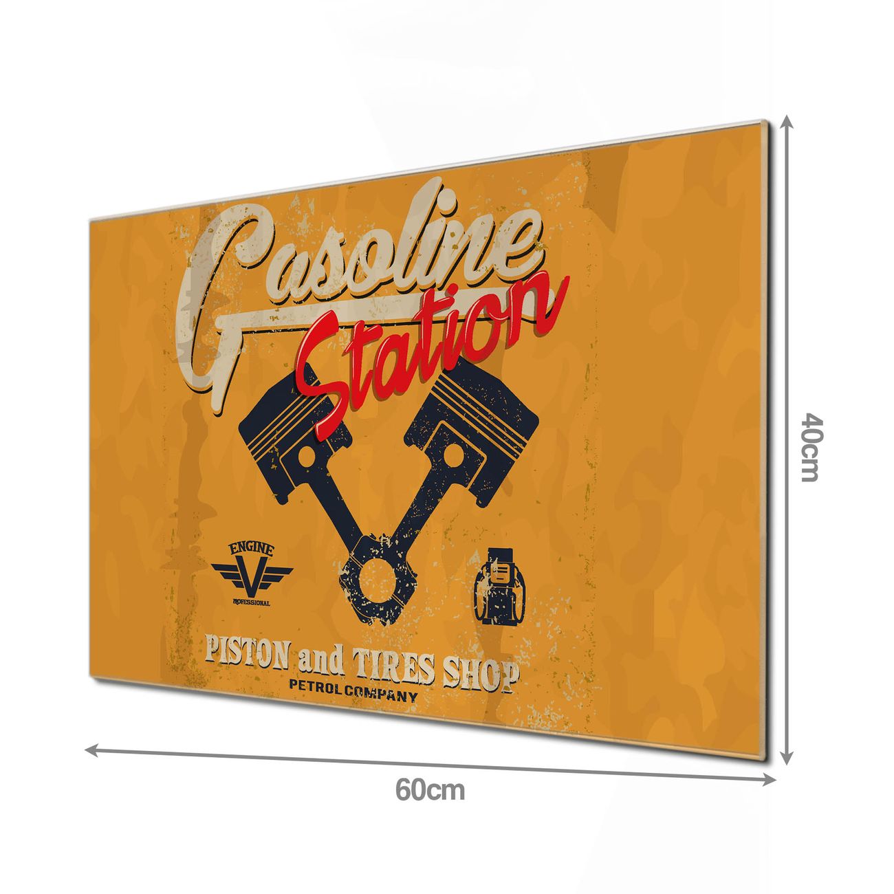 Material: 4mm Sicherheitsglas mit Metallrückwand Eigenschaften: beschreibbar, magnetisch, kratzfest Maße: 60x40x0,6cm, 3,6kg schwer Motiv Nummer 11147 Gasoline Station Zubehör: inklusive 4 Neodym-Magnete