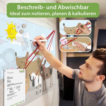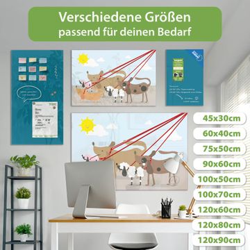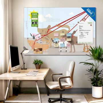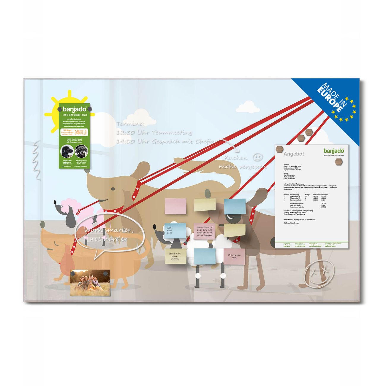 Material: 4mm Sicherheitsglas mit Metallrückwand Eigenschaften: beschreibbar, magnetisch, kratzfest Maße: 120x80x0,6cm, 14,40kg schwer Motiv Nummer 11883 Gassi Gehen Zubehör: inklusive 4 Neodym-Magnete