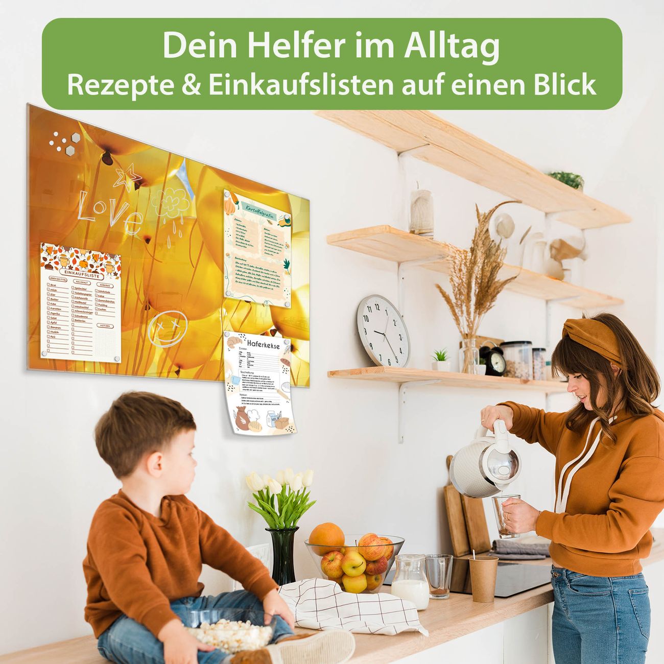 Ein Stück Design, das Ihren Alltag organisiert. Schreiben, heften, inspirieren - alles an einem Ort. Qualität, die man spürt. Montage leicht gemacht. Handwerk mit Herz - veredelt in Sachsen. Einzigartiges Design mit Motiv Motiv Gelbe Luftballons Beschreibbare Glasoberfläche, leicht zu reinigen Starke Magnetkraft durch Stahlrückwand Inklusive 4 Neodym-Magneten Flexible Montageoptionen Handveredelt in Sachsen - Qualität, die bleibt