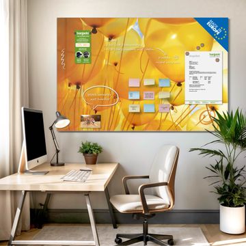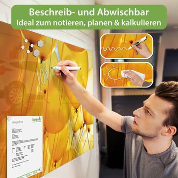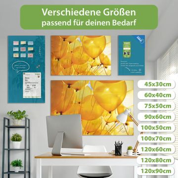 Material: 4mm Sicherheitsglas mit Metallrückwand Eigenschaften: beschreibbar, magnetisch, kratzfest Maße: 120x80x0,6cm, 14,40kg schwer Motiv Nummer 12460 Gelbe Luftballons Zubehör: inklusive 4 Neodym-Magnete