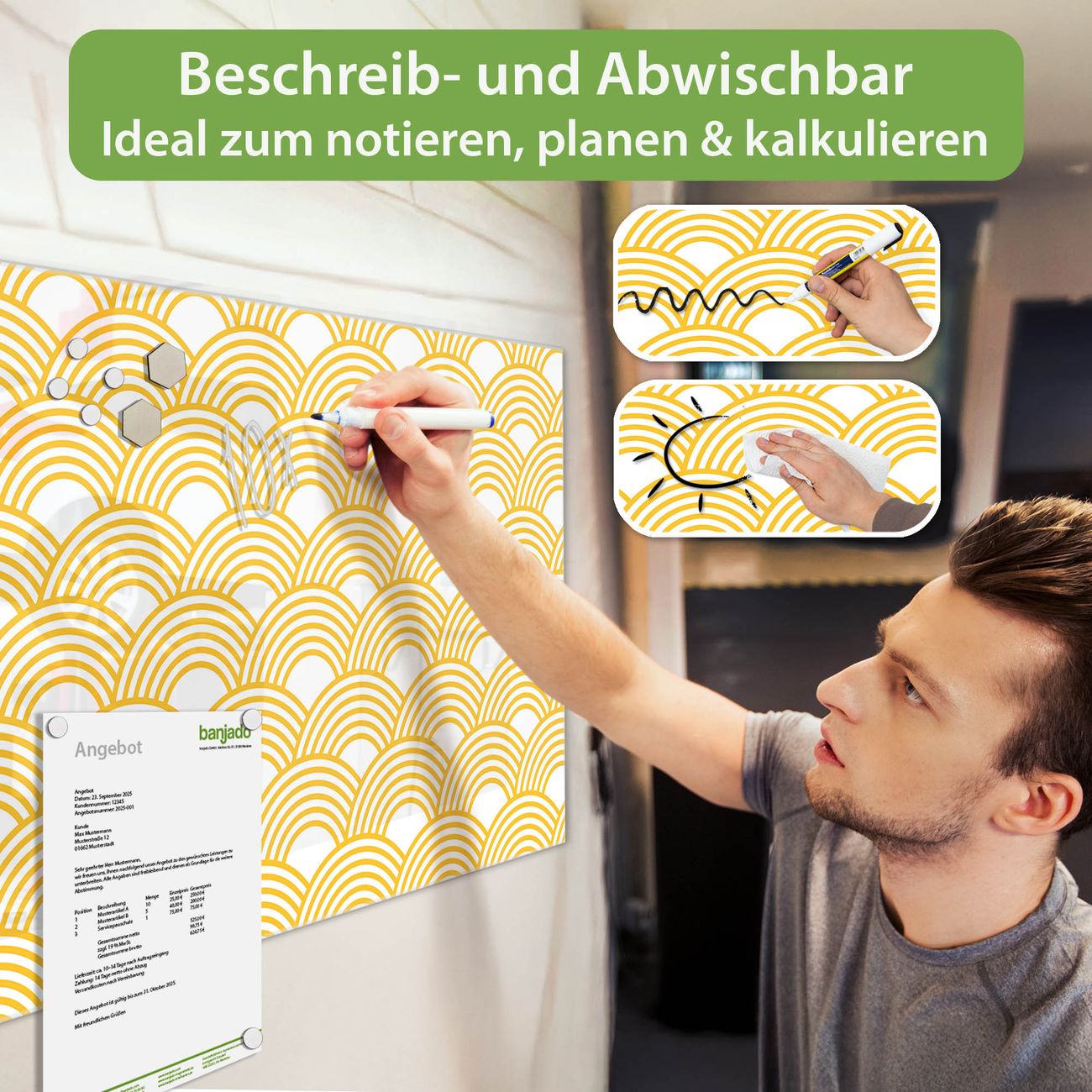 Material: 4mm Sicherheitsglas mit Metallrückwand Eigenschaften: beschreibbar, magnetisch, kratzfest Maße: 120x60x0,6cm, 10,80kg schwer Motiv Nummer 12597 Gelbe Wellen Zubehör: inklusive 4 Neodym-Magnete