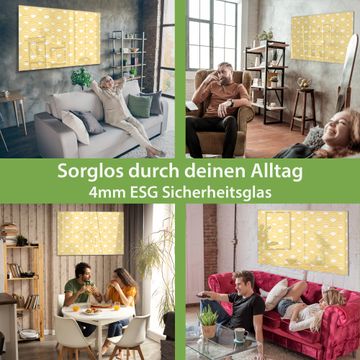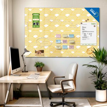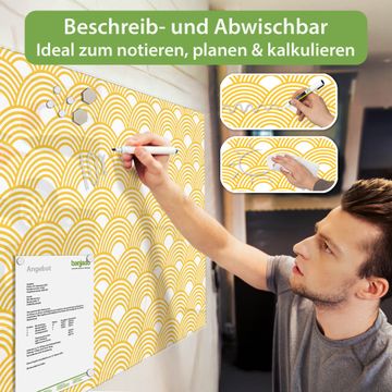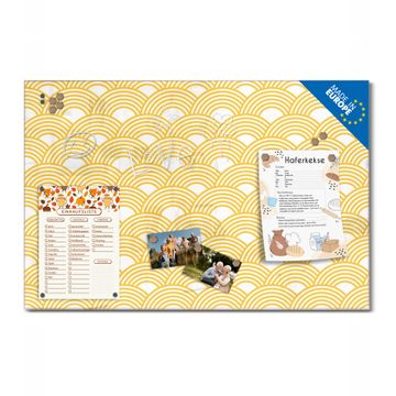 Material: 4mm Sicherheitsglas mit Metallrückwand Eigenschaften: beschreibbar, magnetisch, kratzfest Maße: 45x30x0,6cm, 2,03kg schwer Motiv Nummer 12597 Gelbe Wellen Zubehör: inklusive 4 Neodym-Magnete