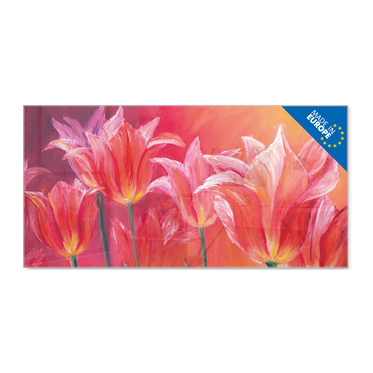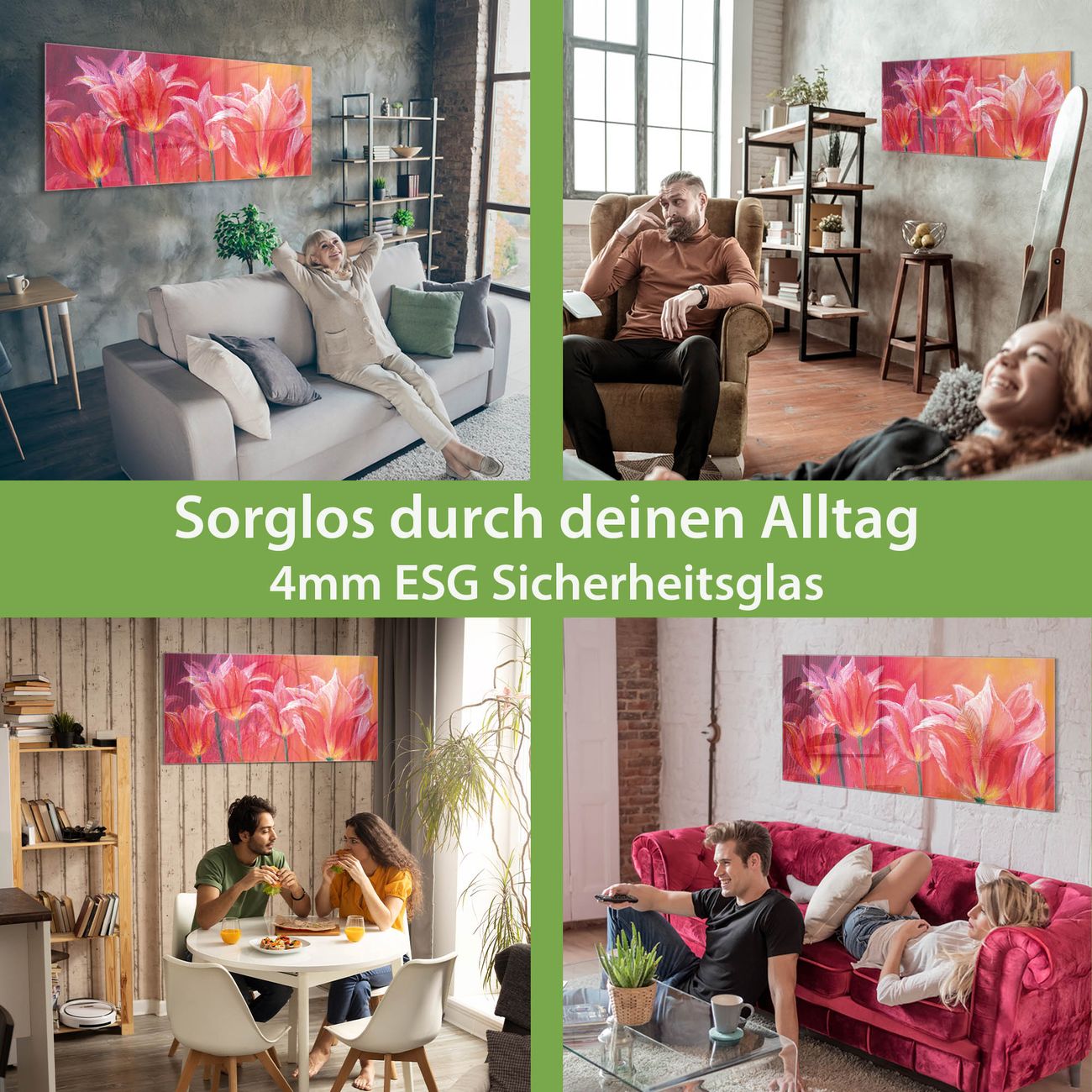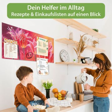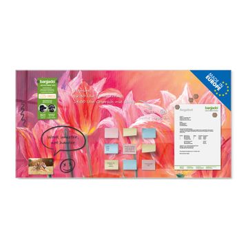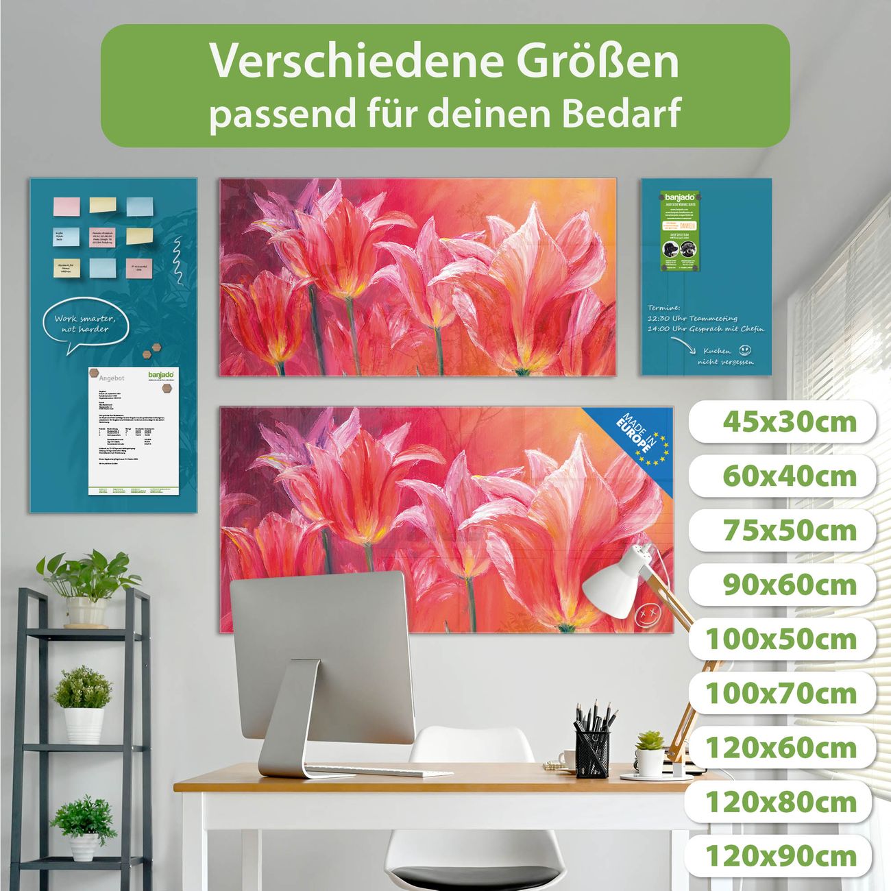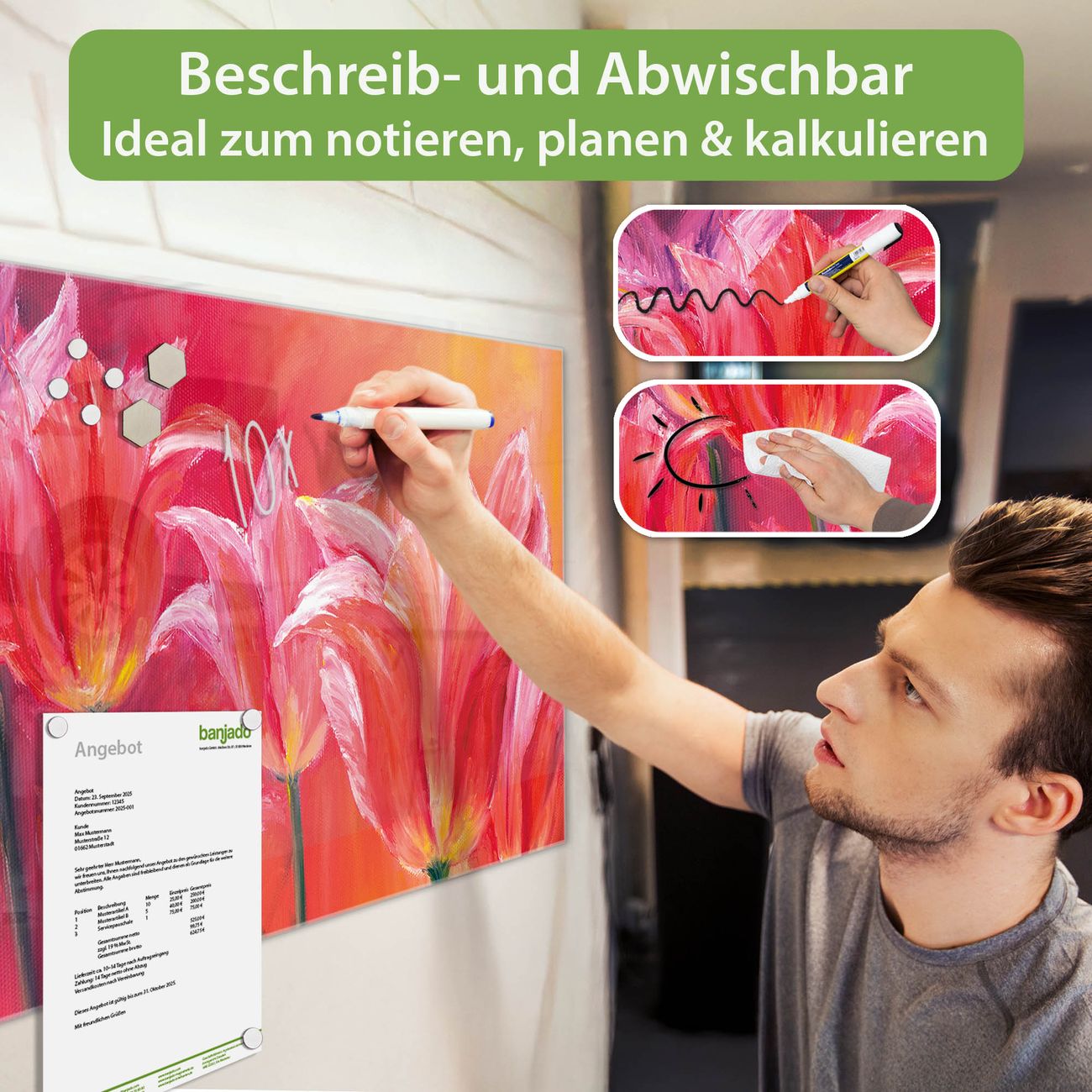 Material: 4mm Sicherheitsglas mit Metallrückwand Eigenschaften: beschreibbar, magnetisch, kratzfest Maße: 120x60x0,6cm, 10,80kg schwer Motiv Nummer 12310 Gemalte Tulpen Zubehör: inklusive 4 Neodym-Magnete