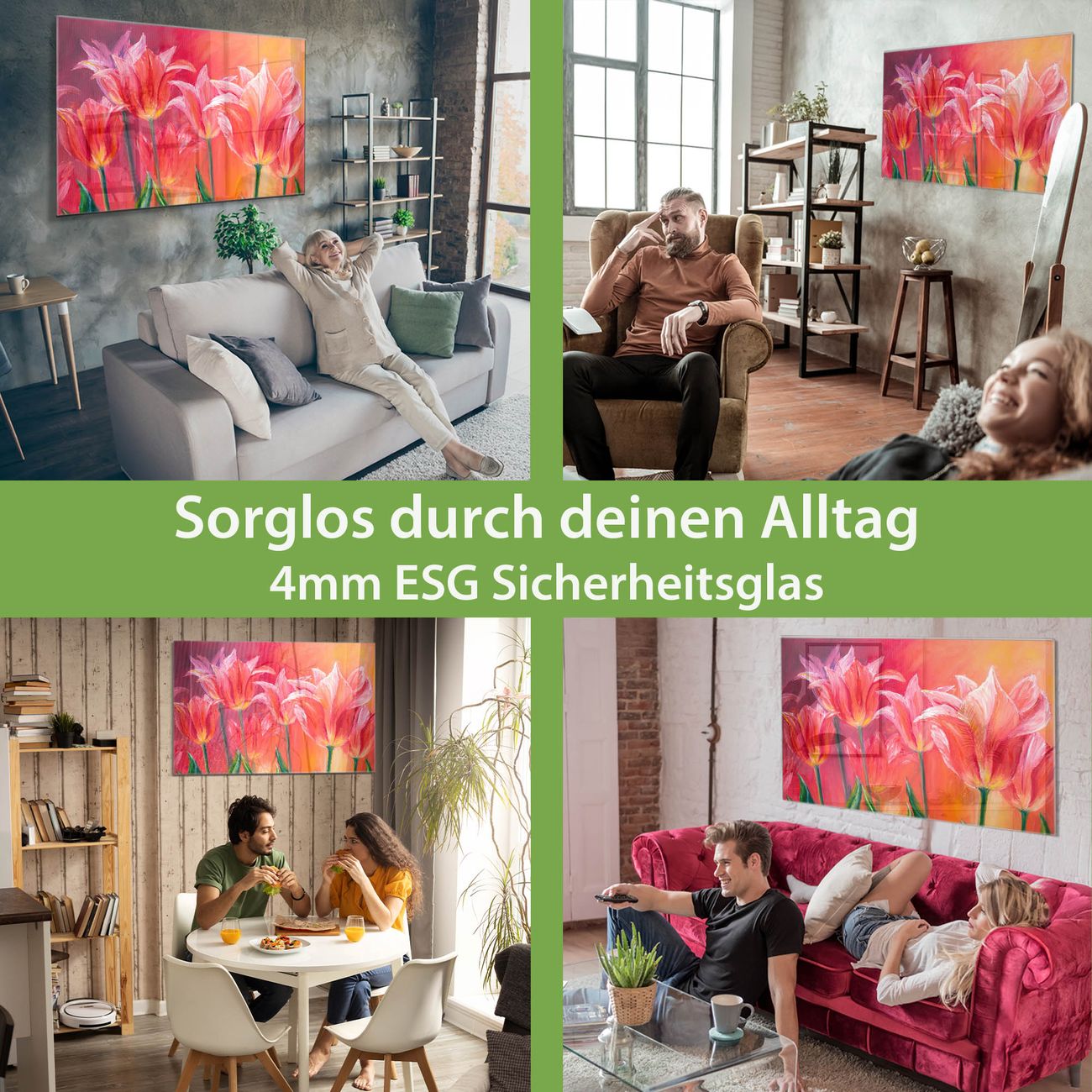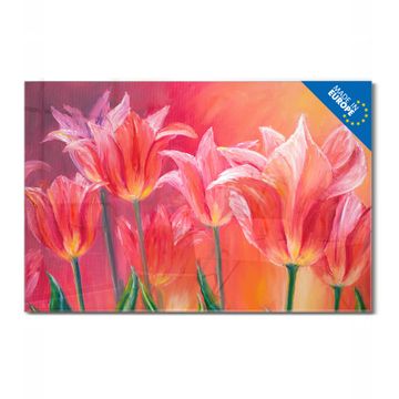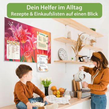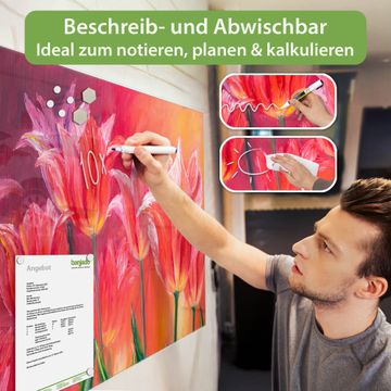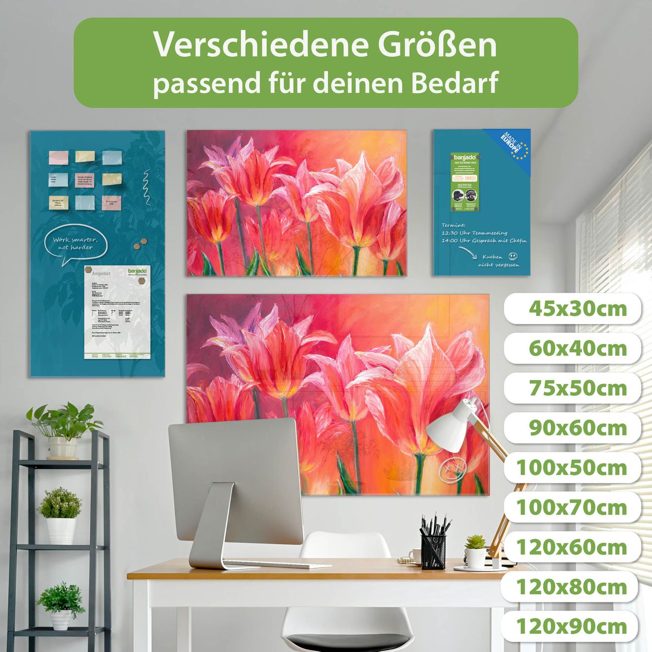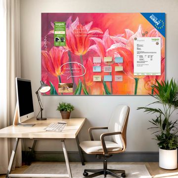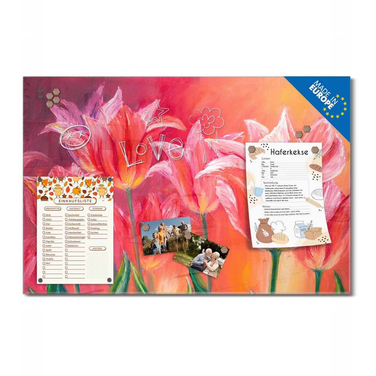 Material: 4mm Sicherheitsglas mit Metallrückwand Eigenschaften: beschreibbar, magnetisch, kratzfest Maße: 75x50x0,6cm, 5,63kg schwer Motiv Nummer 12310 Gemalte Tulpen Zubehör: inklusive 4 Neodym-Magnete