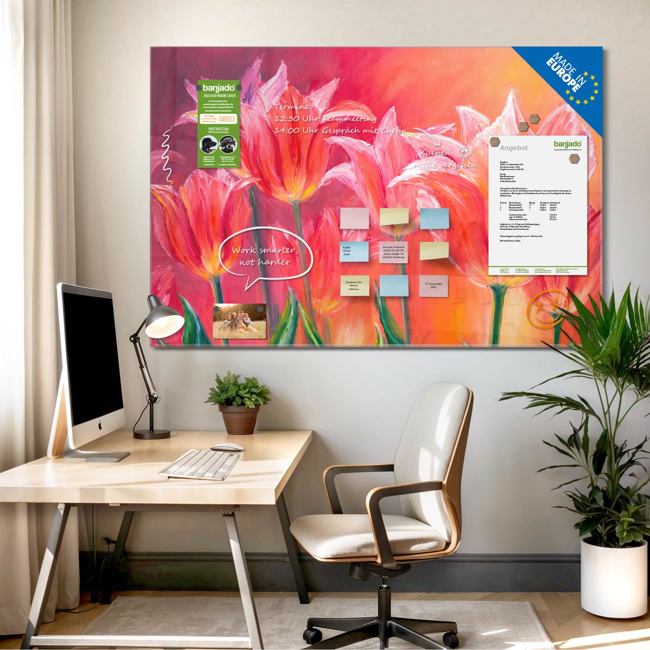 Die banjado Glas Magnettafel mit dem Motiv Motiv Gemalte Tulpen verbindet Funktionalität mit Stil. Sie ersetzt das Zettelchaos durch klare Strukturen und bringt dabei eine warme, natürliche Atmosphäre in Ihr Zuhause. Ob im Büro, in der Küche oder im Eingangsbereich - dieses Design-Board zieht Blicke an und sorgt für Ordnung mit Charakter.