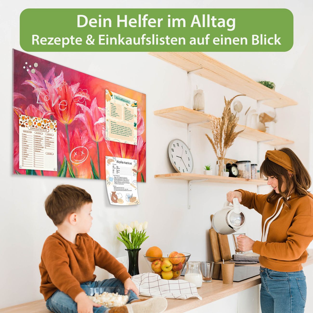 Ein Stück Design, das Ihren Alltag organisiert. Schreiben, heften, inspirieren - alles an einem Ort. Qualität, die man spürt. Montage leicht gemacht. Handwerk mit Herz - veredelt in Sachsen. Einzigartiges Design mit Motiv Motiv Gemalte Tulpen Beschreibbare Glasoberfläche, leicht zu reinigen Starke Magnetkraft durch Stahlrückwand Inklusive 4 Neodym-Magneten Flexible Montageoptionen Handveredelt in Sachsen - Qualität, die bleibt