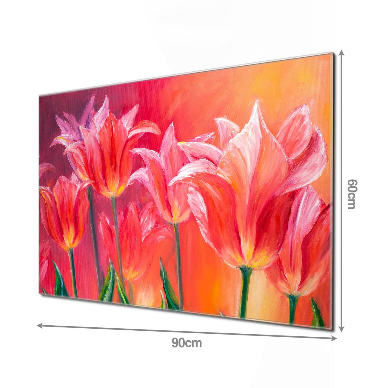 Material: 4mm Sicherheitsglas mit Metallrückwand Eigenschaften: beschreibbar, magnetisch, kratzfest Maße: 90x60x0,6cm, 8,10kg schwer Motiv Nummer 12310 Gemalte Tulpen Zubehör: inklusive 4 Neodym-Magnete