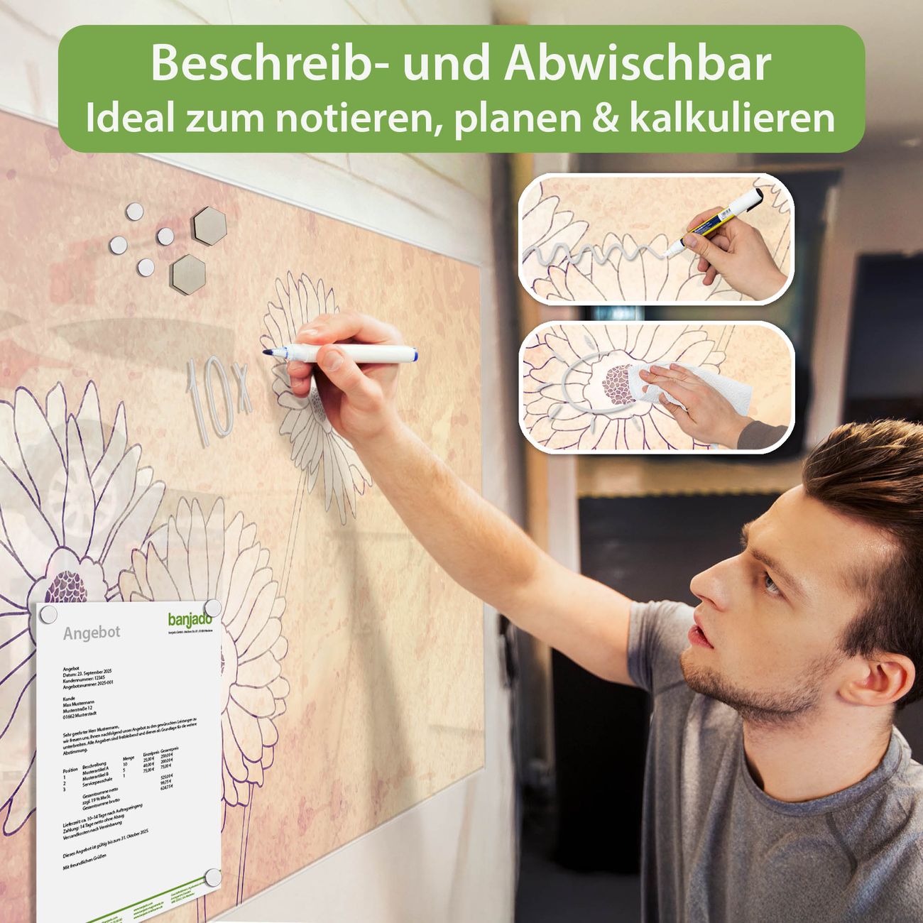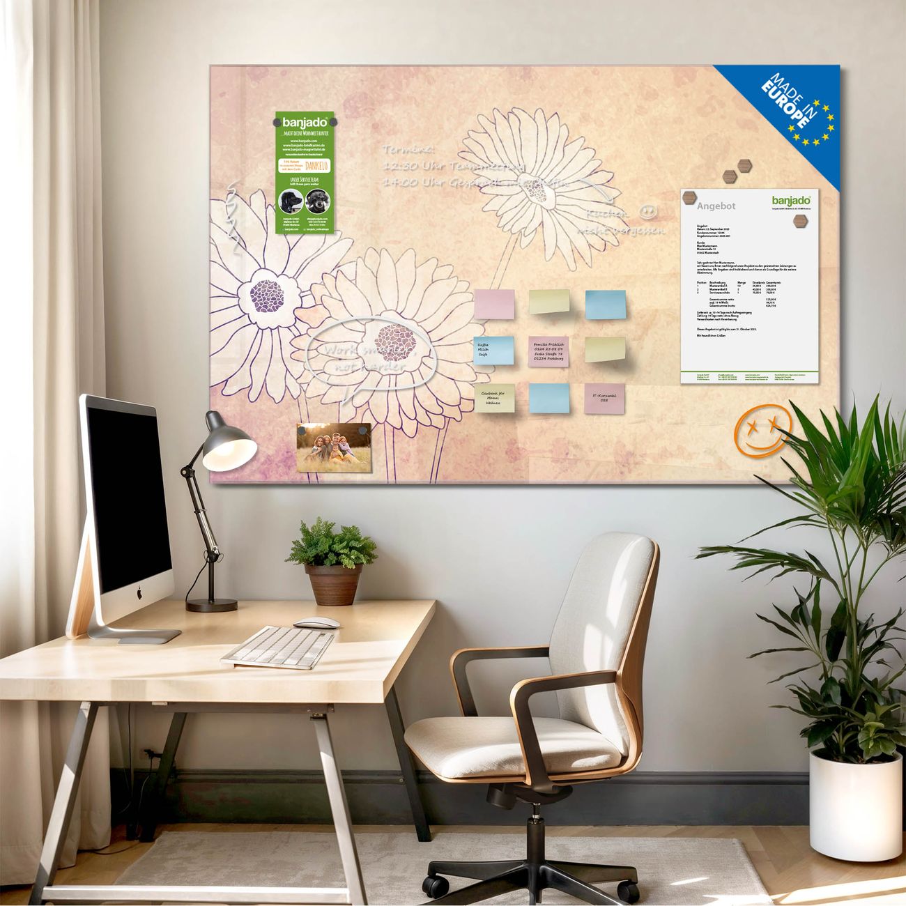 Die banjado Glas Magnettafel mit dem Motiv Motiv Gerbera verbindet Funktionalität mit Stil. Sie ersetzt das Zettelchaos durch klare Strukturen und bringt dabei eine warme, natürliche Atmosphäre in Ihr Zuhause. Ob im Büro, in der Küche oder im Eingangsbereich - dieses Design-Board zieht Blicke an und sorgt für Ordnung mit Charakter.