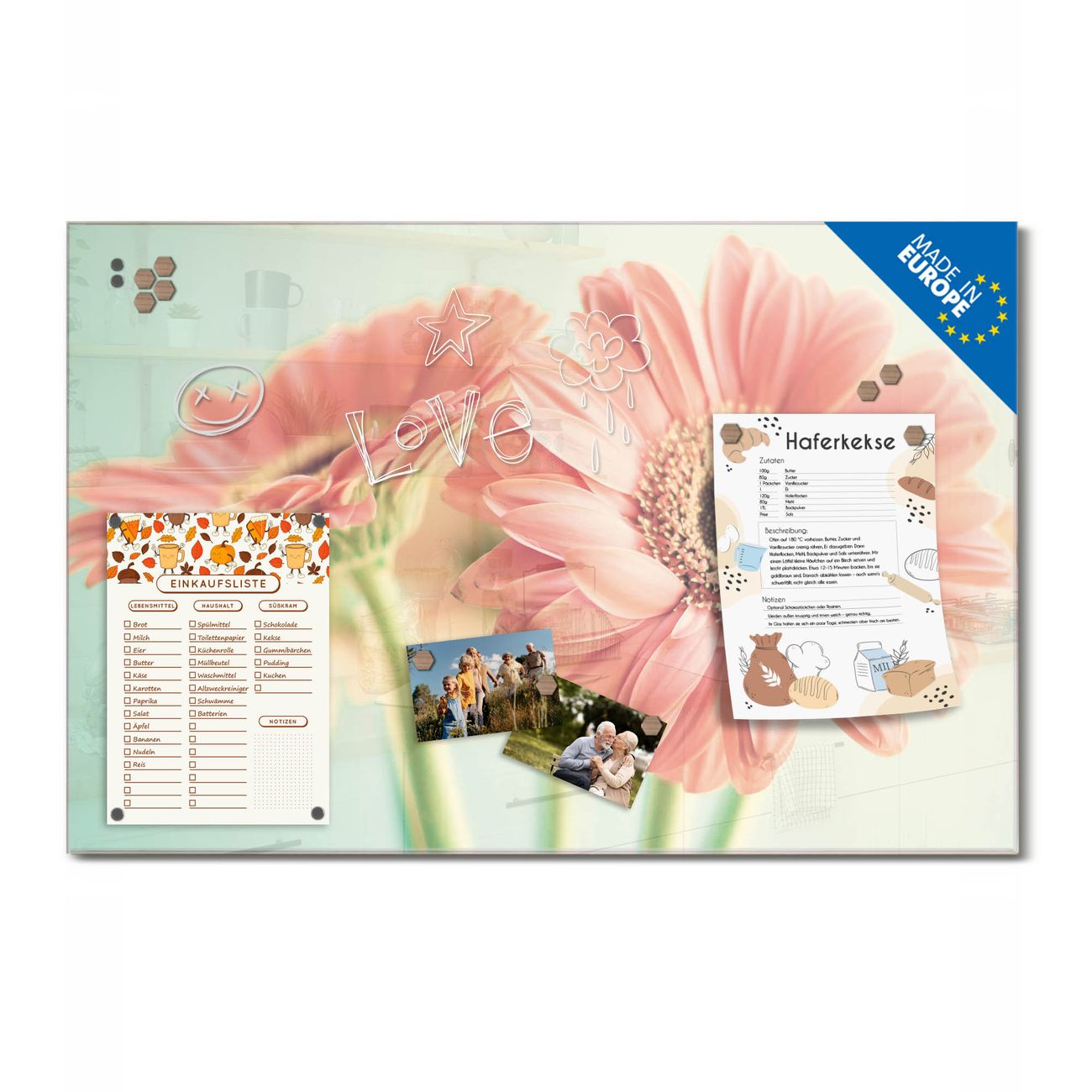 Material: 4mm Sicherheitsglas mit Metallrückwand Eigenschaften: beschreibbar, magnetisch, kratzfest Maße: 75x50x0,6cm, 5,63kg schwer Motiv Nummer 11896 Fünf Gerbera Zubehör: inklusive 4 Neodym-Magnete