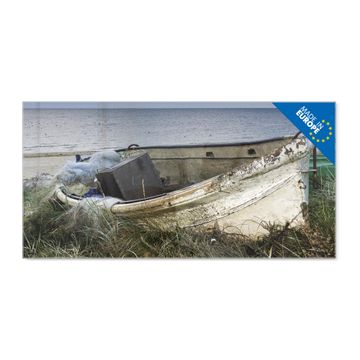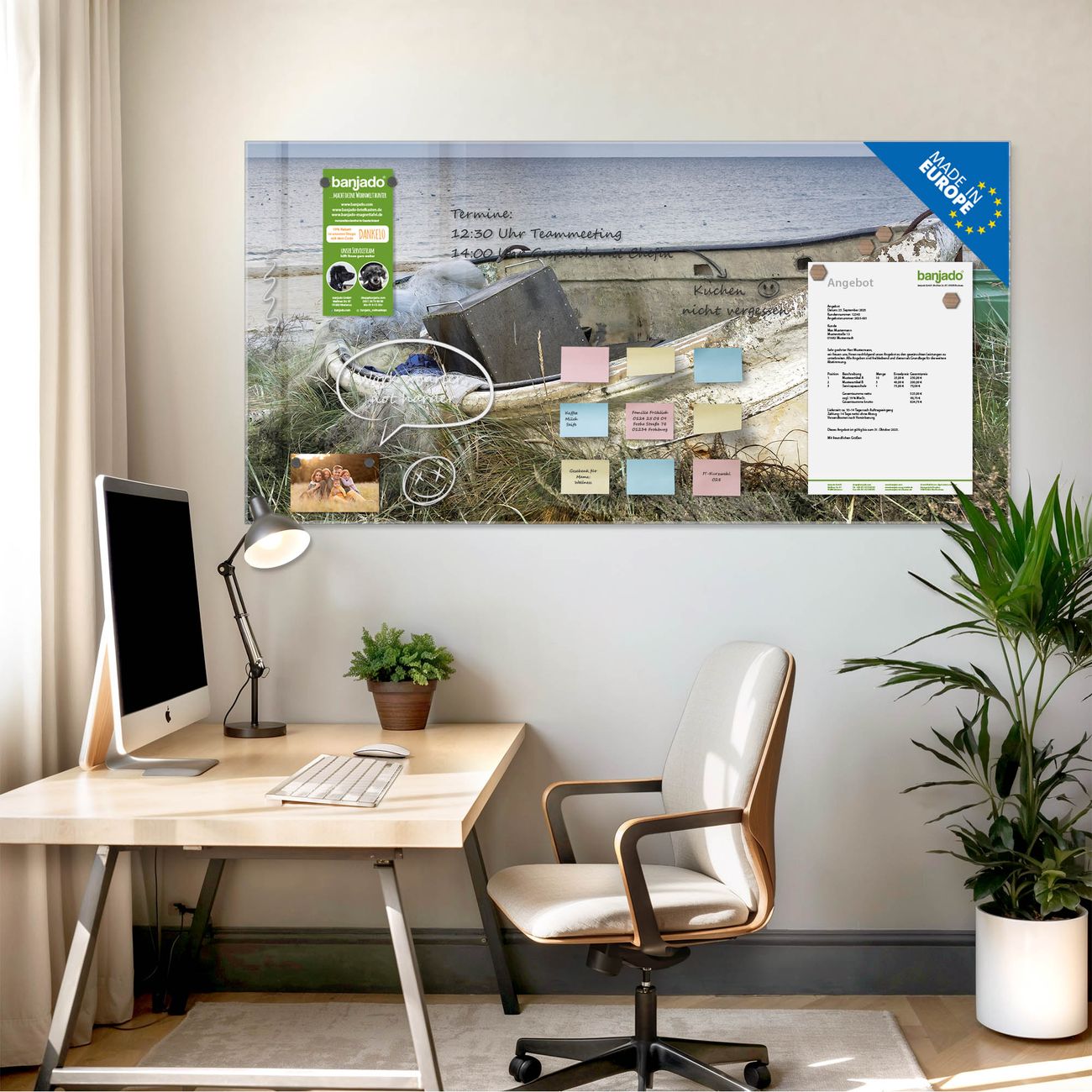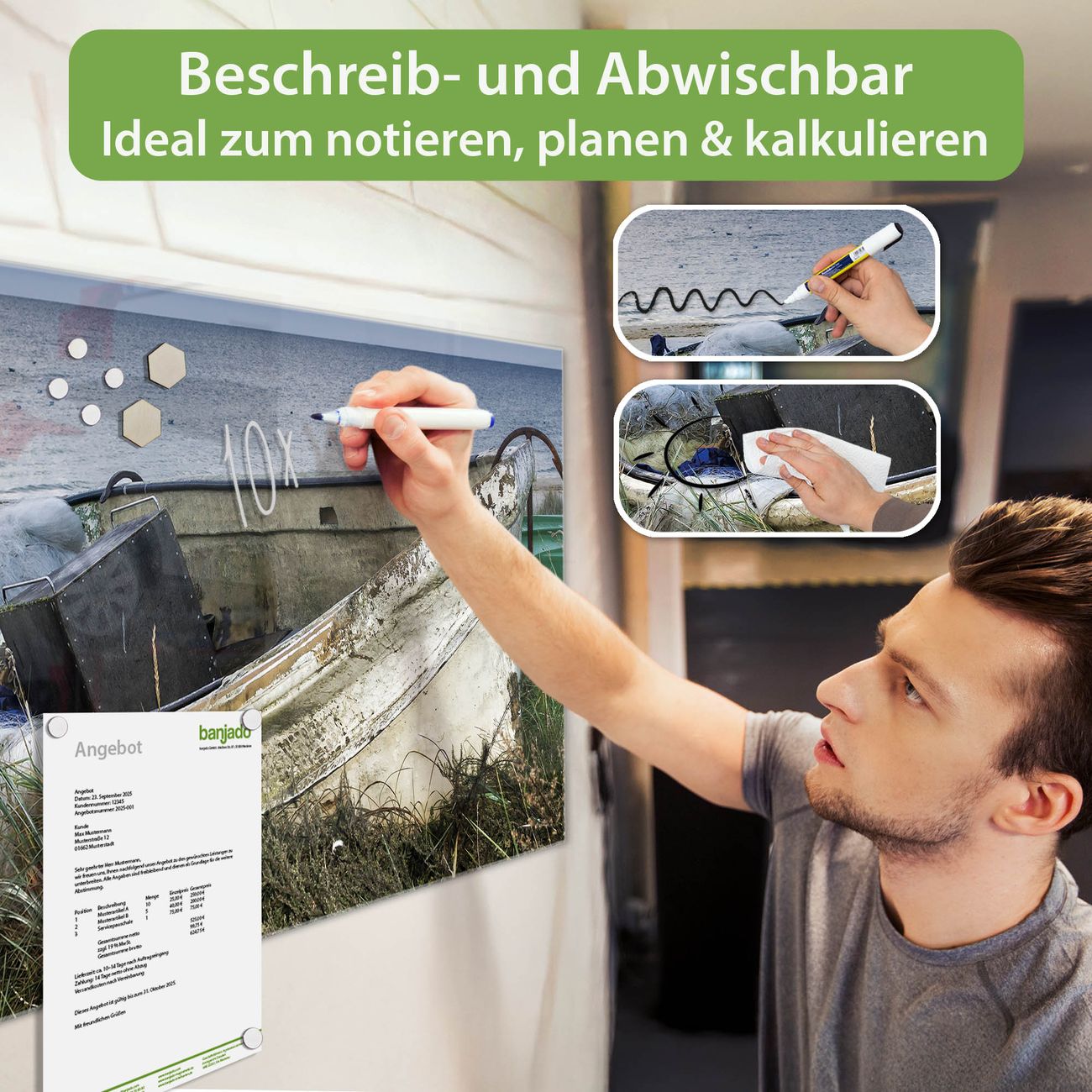 Material: 4mm Sicherheitsglas mit Metallrückwand Eigenschaften: beschreibbar, magnetisch, kratzfest Maße: 110x55x0,6cm, 9,08kg schwer Motiv Nummer 12085 Vergessenes Fischerboot Zubehör: inklusive 4 Neodym-Magnete